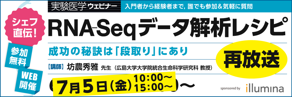 6月5日に開催した「シェフ直伝!RNA-Seqデータ解析レシピ」は,講師の坊農秀雅先生よりRNA-Seqデータ解析の全体像から,リファレンス配列あり/なしの場合の解析事例までをご紹介いただくとともに,皆さまからお寄せいただいた多数の質問にも時間の許す限り回答いただいた濃密なウェビナーとなりました.