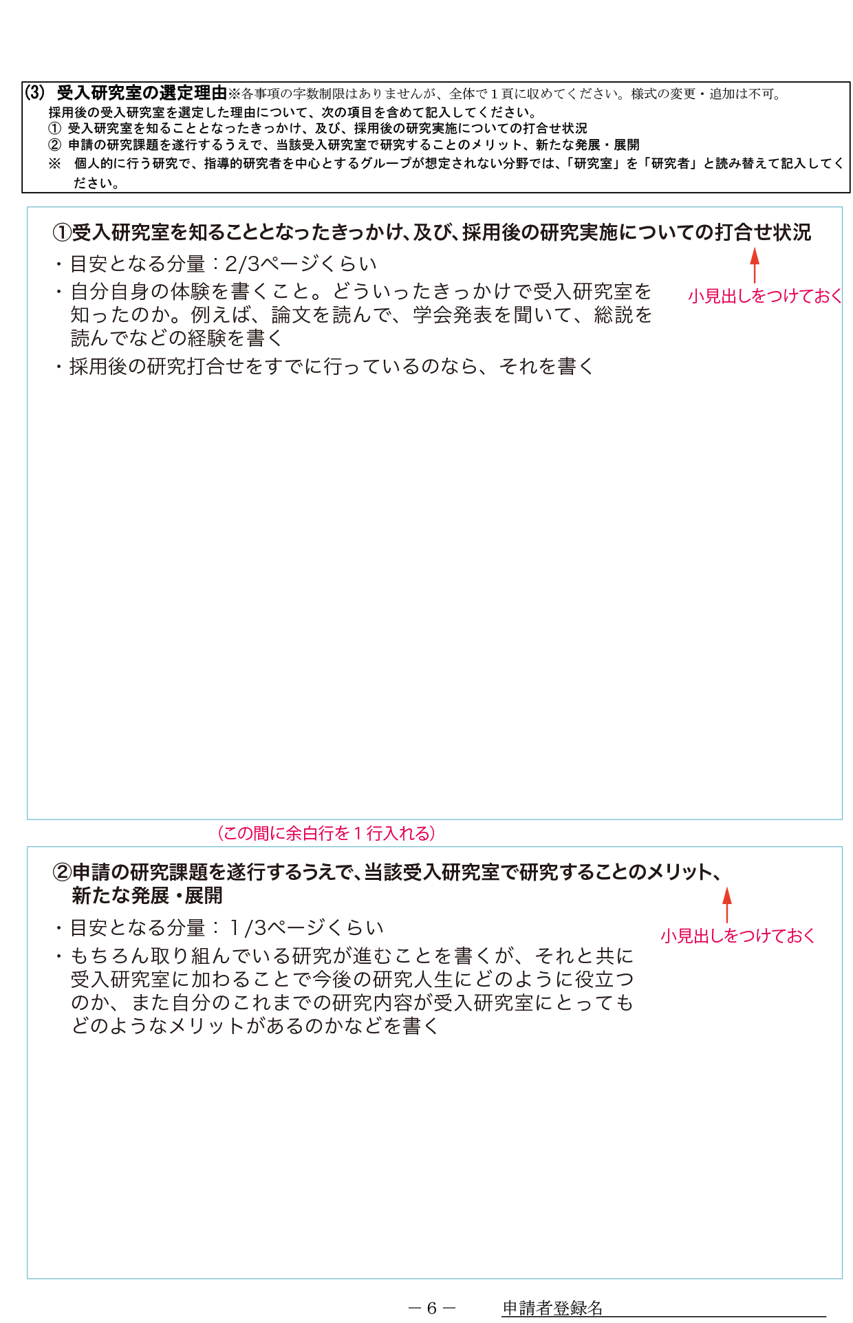 ※DC1・DC2の申請書は,PDのものから「受入研究室の選定理由」がなくなっただけで,それ以外のフォーマットは共通なのでここではPDのものを使って例示する.