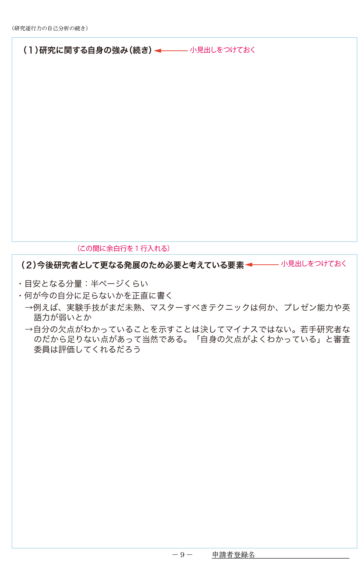 ただ学術振興会 特別研究員公募の場合は,若手や学生を対象としているため,他の申請書と異なる項目がいくつかある.それは,①受入研究室の選定理由,②研究遂行力の自己分析,③目指す研究者像等の3つである.①は書きやすいが,②と③は自分自身のことなので書きにくいことと思う.注意点は,誰でもが書けるような内容ではなく,応募者のオリジナルな体験を活かして具体的に書くということだ.ここではスペースの配分と記載内容の方針をまとめているので,ぜひ参考にして応募書類を作っていってほしい.なお,実際の記入例を知りたい方は本書も参照されたい.