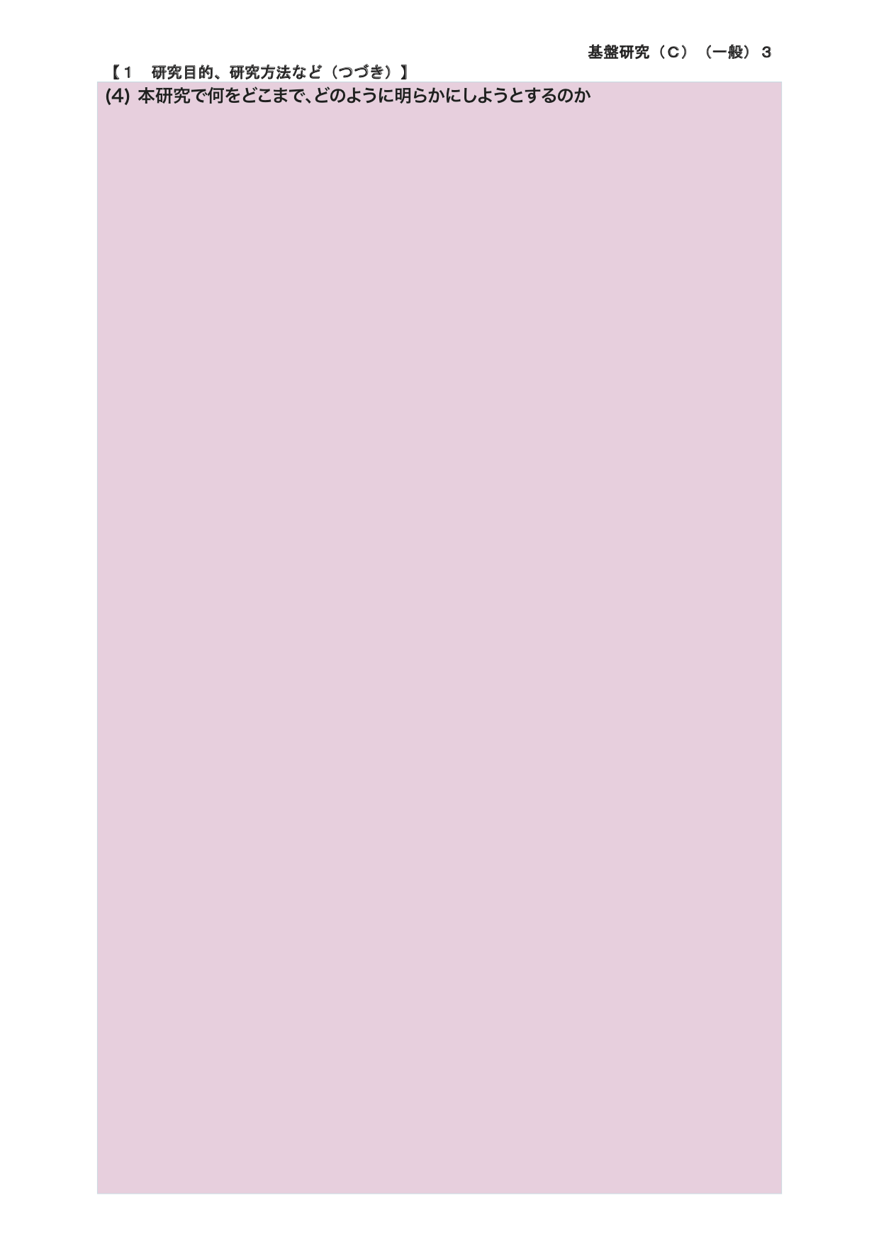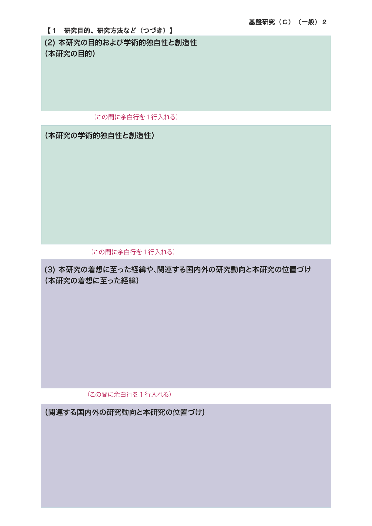 今回の改訂では,これまでの申請書と比べて記載する内容に変更はなく,記載欄と記載順の変更だけなので,比較的対応しやすいと思う.基盤研究(B, C)と若手研究の申請書様式はまだ公開されていないが,基盤研究(S, A)から推測すると,基盤研究(B)では「1研究目的,研究方法など」が5ページ,基盤研究(C)と若手研究では「1研究目的,研究方法など」が4ページになるものと思われる.