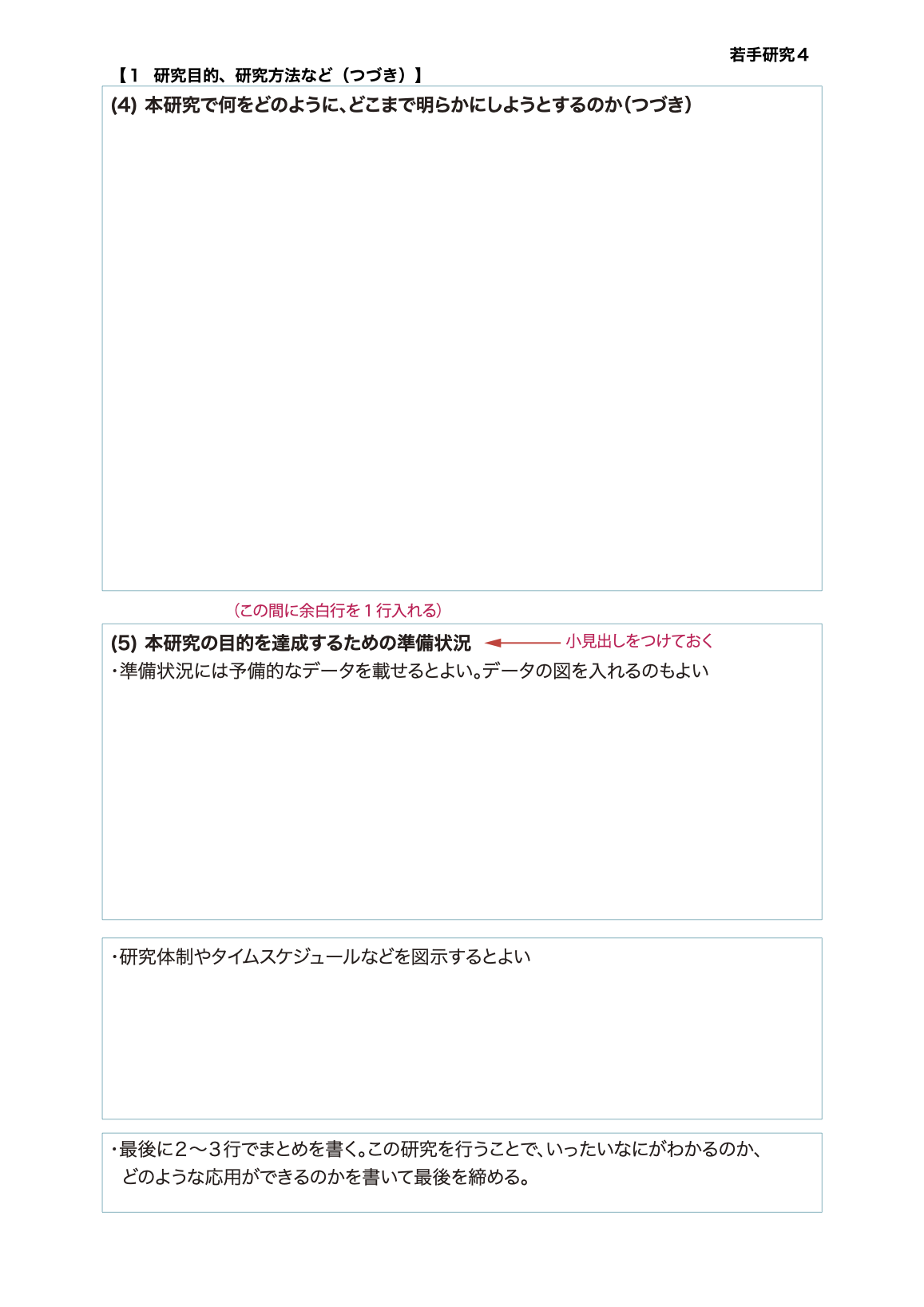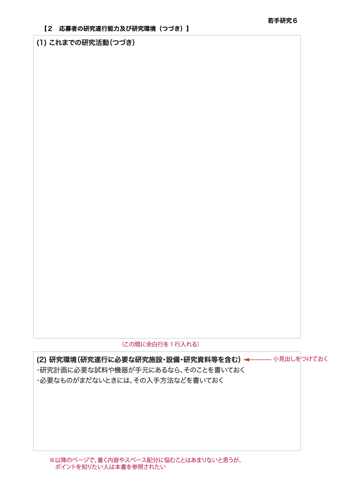2024年の公募から,フォーマットがやや変更になり,「本研究の着想に至った経緯」の位置が変わっている.ここで紹介するスペース配分にはそれらの変更を反映してあるので参考にしてほしい.