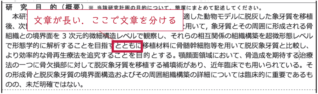 この例の場合,『目指すとともに』でカットして,文章を分ける.さらに言葉を付け加えて文章をわかりやすくし,全体を整える.