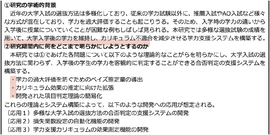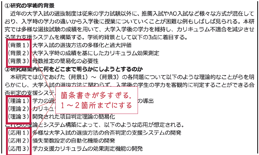 箇条書きは研究項目をまとめるのによい手段だが,多すぎると逆効果になる.最適な箇条書きの数は1ページに1箇所以内.【研究目的】2ページのなかでも1箇所くらいがよい.それより多いときにはいくつかは箇条書きをやめて,文章でつなげて書く方がまとまった印象になる(ただし,ひとかたまりの文とするためには文章作成スキルを要する場合は多く,書き慣れないうちはお勧めしない).