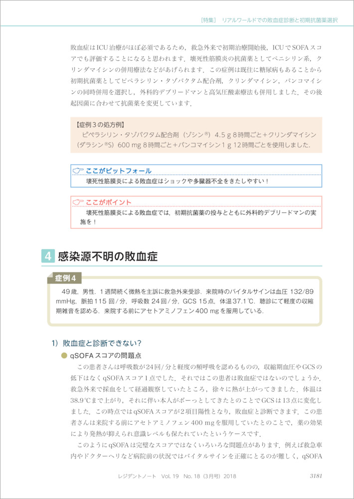 敗血症・敗血症性ショックは合併症・死亡率が高い疾患ですが,内科エマージェンシーであるにもかかわらず(この前書きを執筆している)2017年現在も国民への啓発だけでなく医療現場のスタッフにおいても十分に認識されているとはいえない状況です. また敗血症・敗血症性ショックは本書の主な読者であるジュニアレジデント,シニアレジデントの皆さんにとってもER,一般病棟を含め,初期診療のファーストタッチにかかわる頻度も高い疾患です. 2016~2017年にかけて定義が改定され,世界でも国内でもガイドラインが更新されました.本特集では敗血症の新たな診断基準および新ガイドラインを臨床現場のリアルワールドで効果的に活かすことを目標として,特に初期診療の最も重要なポイントである,下記4点に重点をおいて編集を行いました. ① いかに速やかに診断するか―病歴,身体診察,検査と非敗血症性疾患の鑑別を行うか ② いかに速やかに治療―特に適切な抗菌薬投与―を行うか ③ いかに速やかに治療―特に適切な循環管理(輸液,血管作動薬)―を行うか ④ 基礎疾患があるケースではいかに適切に治療―特に循環・呼吸・腎電解質管理―を行うか (中略) 従来レジデントノートは,1,2年目の初期研修医向けの雑誌ですが,敗血症はどの科でも遭遇する疾患であることを考え,出版社には無理を言って内容としてシニアレジデントから専門各科に進むくらいの年次の医師にとっても読み応えがあり,即効性が高いものをめざしました.本特集が,若手の先生方のER,救急病棟,ICU/CCUでの診療の質の向上に寄与し,また心強い味方となってくれることを願ってやみません.