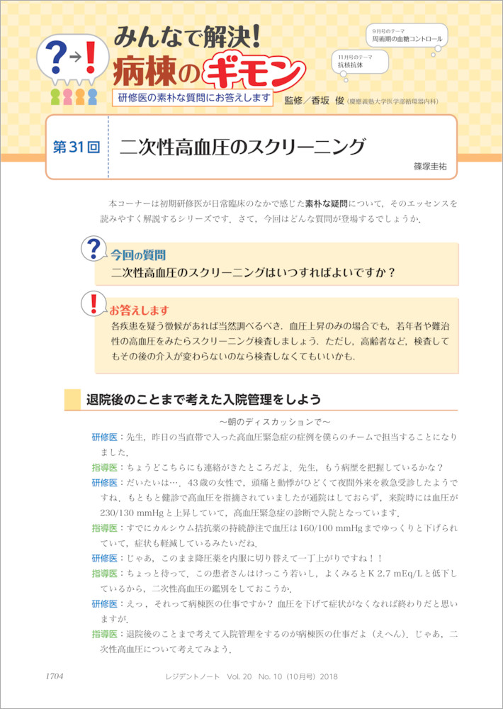 筆者が研修医1年目の頃のことですが,今だに思い出す症例があります.急性肝炎の触れ込みで近医から紹介された60歳代の女性の方.薬物性肝障害の診断で,AST,ALTの値がそれぞれ約8,000 U/L,約6,500 U/Lでした.はじめて経験するこんなに高い数値.ビクビクしながら連日肝機能検査を行い,その結果の解釈を勉強する毎日でした.入院3日目にASTが5,000 U/Lに低下し,ピークアウトしたのかと安心していたところ,指導医が形相を変えて来ました.“PT(prothrombin time:プロトロンビン時間)が今日,40%切っているじゃないか! 知っていたのか.意識レベルは?”すかさず,慌てて患者さんのところに指導医と向かうと,昨日と違い様子がおかしい.呼びかけにも反応が鈍いし,flapping(羽ばたき振戦)も出ている.これがはじめて経験した劇症肝炎の症例でした.血漿交換を含めた内科的治療でなんとか回復しましたが,PT値の変動の速さに驚き,また検査の理解の大切さを思い知りました. 木村公則(東京都立駒込病院 肝臓内科 部長) 続きを読む