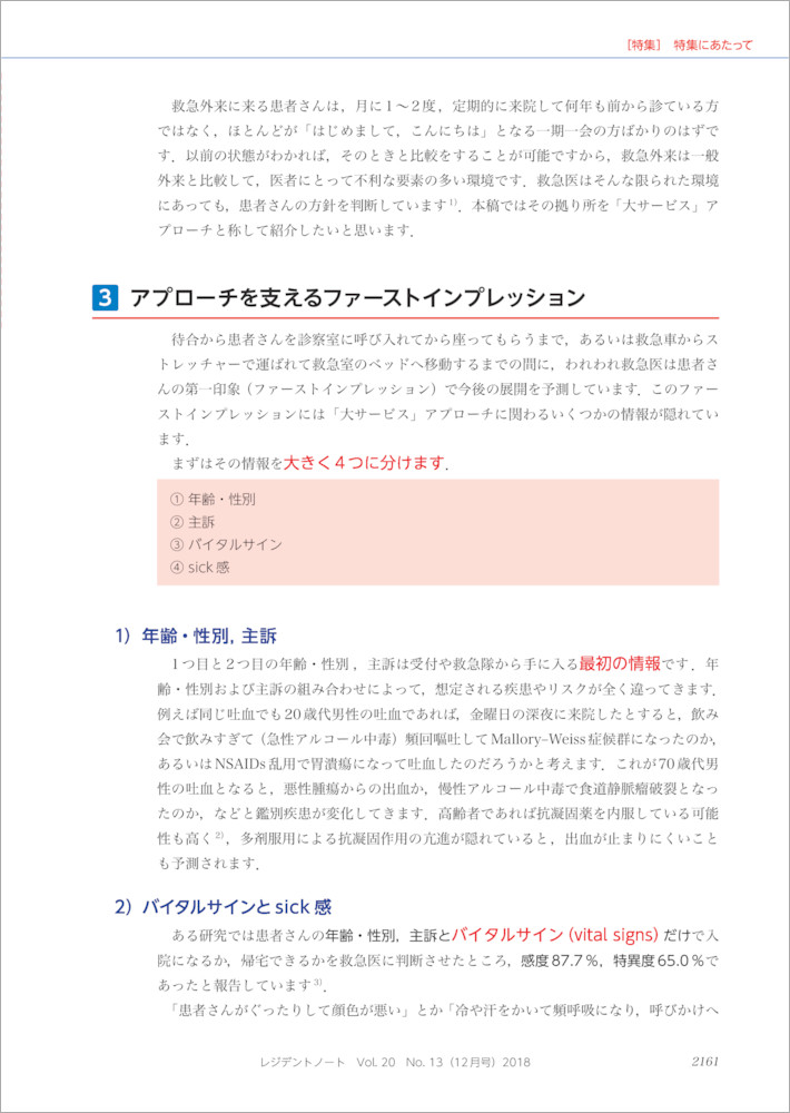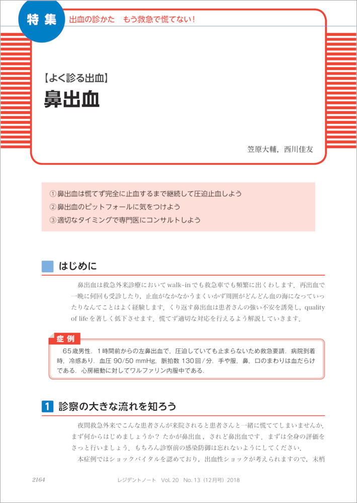 救急外来にはさまざまな出血患者が現れます.とても頻度の高い鼻出血の人や,吐血や喀血のように口から豪快に出血する人,痔などから下血したのをとても不安に思う人,外傷性出血でショックになってしまう人など,救急外来で出血への対応を迫られることは非常によくあることです.こういった【よく診る出血】に対して,原因検索や止血などのマネジメントについて特集を組んでみました.さらには【出血関連で困ること】として,女性の不正性器出血への対応に自信のない諸君へのエールを送りつつ,抗血小板薬・抗凝固薬を内服している人の出血という特殊かつ,救急外来利用者が高齢化していく時代のなかで問題になりやすいことについて取り上げました.出血への対応策の1つである緊急輸血については,いつ判断するのか,注意点は何かを押さえることで,必要性の高いケースを的確に判断し,考える力を身につけられるように工夫しました.そして知っていると役に立つ,地味に困る出血への対応では,致命的ではないがなかなか止血できず,放ってもおけない出血や,小さな出血たちへの基本からウルトラCの対応までをまとめてあります.まさに出血大サービスの特集となっています.