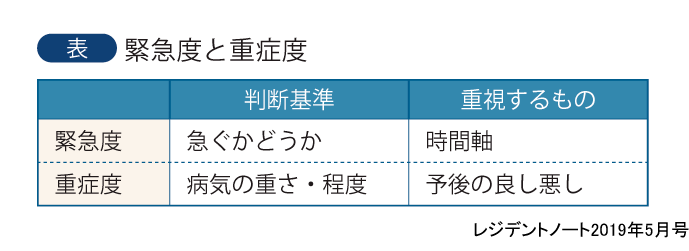 特集にあたって トリアージ総論古川力丸(弘仁会板倉病院 救急診療部 部長) はじめに 今回の特集のテーマは,「トリアージ」です.トリアージとは,多数の患者・傷病者がいるにもかかわらず医療者や医療資源が限られている状況で,緊急性の高い患者・傷病者へ優先的に介入するための,緊急度に重きを置いた選別法をさします.トリアージという考え方は,災害時に限らず日常診療でも重要な考え方です.このご時世,多くの研修医の皆さんはしっかりとした教育プログラム,教育環境で研鑽しており,ひと昔前のような「失敗してもよいから,とりあえず見よう見まねでやってみろ」なんて乱暴な教育を受けることはなくなったことでしょう(と信じております).しかし,トリアージを要するようなパニック環境ではそうもいっていられない状況になるかもしれません. 大規模災害で医師の数が限られ,研修医である皆さんがトリアージに駆り出される…. 新型インフルエンザなどの感染症の流行により,大勢の患者が救急外来に押し寄せ治療優先順位の高い患者を選別しなければならない…. 不幸なことにテロ・事故現場に居合わせてしまい,多数の傷病者を目の前に医療者は自分と同僚研修医の2人だけ…. そんなシチュエーションに出合う可能性はまず低いわけですが,このご時世でも突然の現場デビューをしなければならない可能性があるのが,このトリアージなのです. 1バイタルサインとABC 今回の特集では,まず皆さんにトリアージの重要性と概要を理解していただきます.トリアージを行ううえで重要なポイントは,「バイタルサイン(特に呼吸数)」と「ABC(気道,呼吸,循環)」です.各種トリアージに,この2つの項目がどう活かされているかがわかれば,その重要性は自ずと理解できることでしょう.特にABCは,心肺蘇生教育のような表面的な評価ではトリアージには耐えられません. しっかりと時間をかけた丁寧な診察と,急を要するトリアージは一見すると相反するもののように思えますが,そうではありません.救急領域であれ,総合診療の場であれ,しっかりとしたトリアージができていればこそ,落ち着いてシステマティックな全身評価が行えるものです.研修医の皆さんにこそ,トリアージについての十分な理解をもち,必要なスキルを身に着けてほしいと思います. 2トリアージの歴史と現在 トリアージは,フランス語のtrierからの派生語で,「選別する」という意味です1).古くフランスでは,ブドウやコーヒー豆などの農作物や羊毛などの選別を示す言葉として「trier」が使われていたそうですが,医療でのトリアージは1800年代初頭,かの有名なナポレオンの時代に戦場で負傷した兵士の処置優先順位をつけるために考えられたとされています.当初は,治療により戦場に復帰できる兵士を優先して治療するための手法として行われており,現在の救命のためのトリアージとは少し意味が異なっていたようです. 近年の医療現場でのトリアージとは,緊急度の高い患者・傷病者を選別し,効果的に介入を行うための手法です.救急や災害医療において,多数の救急患者や傷病者がいるなかで,緊急性の高い方を適切に選別することができれば,優先的に介入し,かつ効果的な人的・物的資源の投入を行うことができるという考え方に基づきます.緊急性の切迫度により数段階のレベルに振り分けることが一般的です. 近年の医療トリアージは,限られた医療資源のなかで最大多数の最大幸福を得ることを目的として行われます.助からない患者を,あるいは限られた医療資源では助けることができない患者・傷病者を選別し,切り捨てるという見方もできますが,実際のトリアージではそのようなテレビドラマ的判断を迫られることはほとんどありません.緊急度の高い患者・傷病者を選別し,優先的に介入を行うことにより,さらなる重症化を防ぐことがトリアージの主体です.救急であれ災害であれ,トリアージが行われるほとんどのシチュエーションでは,多くの傷病者は軽症で緊急性が乏しいことも知られています.一方で軽症者の方が訴えは大きく,逆に重症なほど訴えが乏しい(意識障害だったり,ショックや呼吸不全で強く訴えることができない)ことが多いものです.現場での効果的な活動のためには,緊急性の低い患者・傷病者の集約化も重要なのです.研修医の皆さんは,トリアージを効果的に救命・治療を行うための手法と捉えていただいて差し支えありません. 3緊急度と重症度 それでは,トリアージの各論に進む前に,ここで緊急度と重症度の違いについて押さえておきましょう(表).この2つの軸は,似て非なるものです.また,必ずしも相関するとは限りません.緊急度とは,「急ぐかどうか」で,時間軸の問題です.一方,重症度とは病気の重さ・程度をさし,予後の良し悪しの問題となります.例えば末期がんは,予後が悪いですが急ぐわけではありませんので,緊急度は低く重症度が高い,となります.一方,喉頭蓋炎は早急な対応が必要だけれども,適切な対応がとれれば予後はよいですので,緊急度が高く,重症度