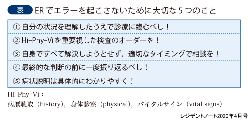 特集にあたって 救急対応の合間にドリルで頭の整理を!坂本 壮(総合病院国保旭中央病院 救急救命科 医長/臨床研修センター 副センター長) 1研修医が苦手な症候は? 研修医の先生は,救急外来で日々多くの患者さんの初療にかかわっていることでしょう.頭痛や胸痛などの疼痛を訴える患者さん,麻痺やめまいを訴える患者さん,転んで出血や腫れを訴える患者さん,さらには動けない,食事が摂れないなど,それのみではなかなか原因がすぐには想起できない患者さんなど,対応しなければならない訴えは多岐にわたります. 私は,現在数十カ所の病院の研修医の先生と学ぶ機会がありますが,病院によらず研修医が苦手としている症候は一緒です.めまい,意識障害,意識消失,疼痛では胸痛や頭痛という研修医もいますが,何より腹痛が苦手という人が多いでしょう.その他,脱力やしびれ,皮疹関連が代表的です.また,普段見慣れていなければ,小児や妊婦,外傷の初期対応も敬遠しがちです. 今月号では,研修医の先生が苦手な症候を,実際に陥りやすい点を整理しやすいように,症例を通じてドリル形式でまとめました. 2知識はもちろん大切! 救急外来で適切な対応を行うためには,知識だけでなく,さまざまなバイアスの関与を意識することが大切です.全体から見れば知識以外の要因の方がエラーには大きく影響しているといわれます.このことに関しては,2019年10月号の特集「救急でのエラー なぜ起きる? どう防ぐ?」を参照してください.そこでも述べましたが,ERでエラーを起こさないためには大切な5つのことが存在すると考えています(表). しかし,当たり前ですが研修医のうちは知識自体がまだまだ足りないため,最低限理解しておくべきことは頭に叩き込んでおく必要があります.なんでもスマホ1つで調べられる時代となりましたが,頻度の高い症候や疾患,緊急度・重症度が高いものに関してはある程度整理しておかなければ,その場で迅速かつ適切な対応はできません. 苦手な症候が研修医で似通っているのと同じように,研修医が陥るエラーも似通っています.これは多くの研修医とかかわっているとわかるものです.今回の特集では,実際に遭遇する頻度の高い症候を取り上げ,陥りやすいエラーも意識した記載をしているので,目の前に患者さんがいることをイメージして読み進めるとよいでしょう. 3救急外来は学びの宝庫である! 自身が経験した症例を大切にしていますか? 研修医の先生が働く病院の多くは電子カルテを使用していると思います.対応した症例のIDを控えておいて,その後どのような経過を辿ったのか,自分がオーダーした画像の読影所見,培養結果などは必ず確認するようにしましょう. 病院ごとに救急外来における症例数の差は確実にあります.しかしそれはたいした問題ではありません.少ない場合には,経験した症例をより深く学び,同期などと経験した症例を共有し,お互いの経験値を上昇させればよいでしょう.多くてもただただ業務をこなしていては成長できません.すべての症例でなくても,1日◯例など,自身で振り返る症例を決めておくとよいでしょう. また,研修医の先生から,フィードバックをもらえなくて困るというコメントをしばしばもらいます.指導医の多くもまた,学年が上がると自身が研修医のときに悩んでいたことを忘れ,どのようにフィードバックすべきかを日々悩んでいます.研修医から具体的な質問事項を思い切って質問してみましょう.いろいろ聞かれて嫌な顔をする指導医は意外と少ないものです.嫌な顔をされたら,私にいつでも質問を!(笑) おわりに 救急対応はどの科に進もうとも逃れることはできません.しかし,初療において行うべきことは意外とシンプルです.今回のドリルを解きながらそれが伝われば嬉しいです. 今回執筆していただいた先生方はレジデントノートの編集, 研修医向けの書籍や連載などを複数書いています.さらに学びたい方はこちらもぜひ.あ, 私の本もね(笑). 参考文献・もっと学びたい人のために レジデントノート増刊「主訴から攻める! 救急画像(Vol.19-No.5)」(舩越 拓/編),羊土社,2017 「タラスコン救急ポケットブック」(Richard J. Hamilton/原著,舩越 拓,本間洋輔,関 藍/監訳),医学書院,2018 レジデントノート2018年6月号「夜間外来の薬の使い分け(Vol.20-No.4)」(薬師寺泰匡/編),羊土社,2018 「君ならどうする!? ER症例に学ぶ 救急診療の思考プロセス」(薬師寺泰匡/編,EM Alliance教育班/著),日本医事新報社,2017 レジデントノート2018年12月号「出血の診かた もう救急で慌てない!(Vol.20-No.13)」(安藤裕貴/編),羊土社,2018 「内科当直医のためのERのTips」(安藤裕貴/著),三輪書店,2017 J-COSMO連載「小児救急外来ただいま診断中!」(竹井寛和,杉中見和,坂本 壮/著),中外医学社,2019〜 「女性の救急外来 ただいま診断中!」(井上真智子/編,柴田綾子,水谷佳敬/著),中外医学社,2017 J-COSMO連載「ほんまでっか〜!? 目からうろこの女性の診かた」(柴田綾子/著),中外医学社,2019〜 「救急外来 ただいま診断中!」(坂本 壮/著),中外医学社,2015 「ビビらず当直できる 