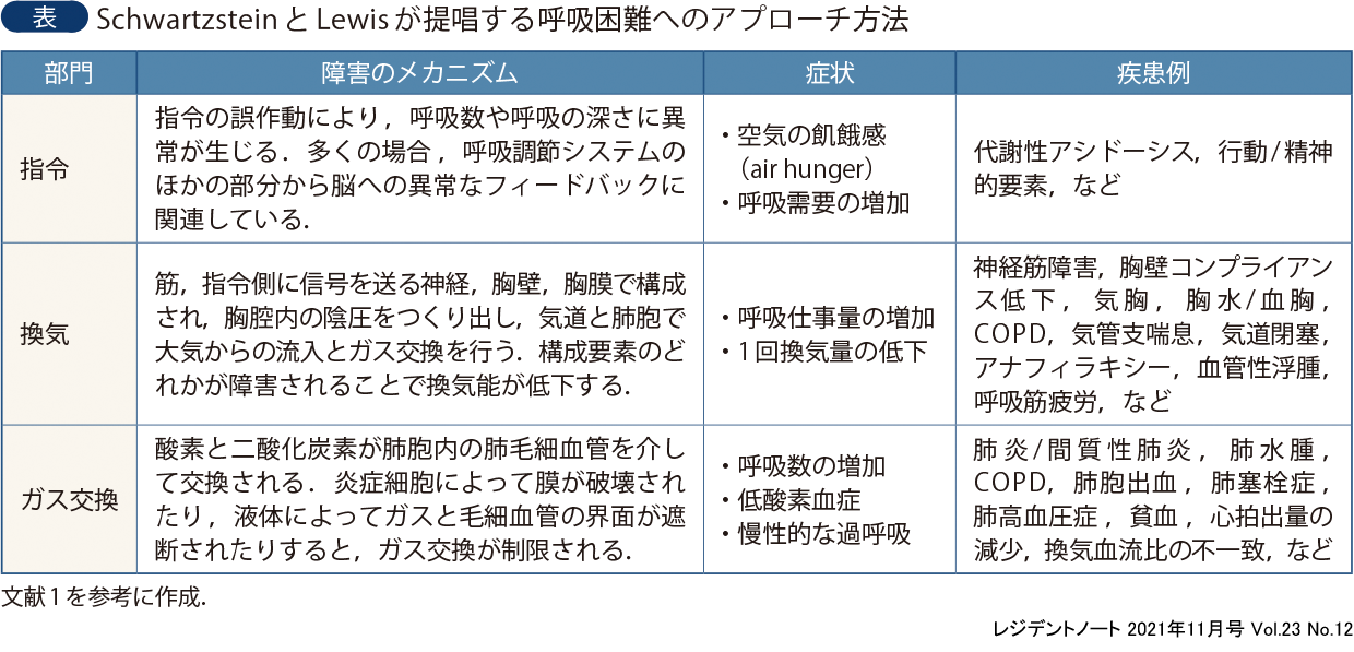 特集にあたって “呼吸困難”って何だろう:“考えて,動く”ために知っておくべきこと 武部弘太郎(京都府立医科大学 救急医療学教室/京都府立医科大学附属北部医療センター 救急科) 「鼻が詰まったりすると 解るんだ 今まで呼吸をしていた事」 これは,私が好きなロックバンドBUMP OF CHICKENの『supernova』という曲に出てくる歌詞です.普段私たちが無意識に行っている呼吸.それは当たり前すぎる存在でありながら,生命維持にとって必要不可欠な存在でもあります.そんな呼吸も,鼻が詰まることでヒトは不快感を感じ,改めてその大切な存在に気づくのです.…と勝手に歌詞を解釈してみましたが,ここで登場した鼻が詰まることで感じる「不快感」,これこそが今回のテーマである「呼吸困難」です. では,なぜヒトは鼻が詰まると呼吸困難を感じるのでしょうか.引き続き勝手に紐解いてみたいと思います. 1呼吸調節のメカニズム 呼吸は,脳幹部(主に延髄)にある呼吸中枢が,末梢の受容器である機械受容器や化学受容器と連動することで調節されます.気道の刺激や肺の伸展,さらには呼吸筋や胸郭の動きを機械受容器が感じとって,呼吸中枢へ情報を伝え,呼吸中枢から呼吸筋に命令を出すことで呼吸運動が生まれます.化学受容器は中枢と末梢の2つに分類され,呼吸中枢に存在する中枢化学受容器は主にPaCO2の上昇やpHの低下によって刺激され,末梢化学受容器である頸動脈体(総頸動脈分岐部に存在)と大動脈体(大動脈弓に存在)は主にPaO2の低下によって刺激され,呼吸を調節しています. 2呼吸困難のメカニズム 呼吸調節のバランスが崩れた(中枢と末梢の間でミスマッチが生じた)とき,呼吸中枢だけでなく大脳皮質にも情報が伝わり,ヒトは不快を感じます.その不快感こそが呼吸困難です.呼吸困難は主観的な症状でありながら,呼吸の恒常性に異常が生じた場合に引き起こされる症状であり,身体が発する危険信号でもあります.また,「呼吸困難」≠「呼吸不全」であり,過換気症候群に限らずたとえSpO2が100%であっても「呼吸困難」は存在します.呼吸困難を訴えている患者さんに「SpO2が100%だから大丈夫!」と説明しても,呼吸困難が解決するわけではありません. 3「鼻が詰まって呼吸困難」はなぜ起こる? ではなぜヒトは鼻が詰まると呼吸困難を感じるのでしょうか.紐解いてみましょう. 呼吸の際にはまず呼吸中枢から息を吸うように指令が出ます.次に指令を受けて末梢の胸郭や呼吸筋が動くのですが,鼻が詰まっていると平常時よりも呼吸運動の負荷が増します.この負荷の増加量が平常時と比較して10〜20%を超える(ミスマッチが生じる)と脳が検知し,呼吸困難を感じます.そこでのミスマッチの程度や代償の範囲によって呼吸困難を感じる程度も変わります. 4呼吸障害を別の視点でとらえる 「呼吸困難」の原因を考えるときに,「呼吸機能のどこが障害されているのか」をとらえることで病態把握や鑑別診断につながることがあります.ここではSchwartzsteinとLewisが提唱する呼吸困難へのアプローチ方法を紹介します.呼吸機能を中枢からの指令・換気・ガス交換の3部門に分け,それぞれが障害されたときの症状や疾患例をまとめています(表)1).前述した呼吸調節のメカニズムと合わせて考えると,より理解が深まります. 5考えて,動く! ここまでメカニズムを中心に解説してきましたが,ここでは私が呼吸困難診療で大切にしている「考える」と「動く」を紹介します. 1つ目は「考える」です.「呼吸のメカニズムのなかで何が問題なのか」,「どういった病態・疾患に結びつくのか」,などを考えて診療することが大切で,その後の鑑別や検査,さらには診断や治療に結びつきます.マニュアル本に沿って診断を当てはめるだけでなく,呼吸生理や病態を考える習慣をもつことで,より理解が深まります. 2つ目は「動く」です.ときに緊急性が高く,迅速な対応が求められる呼吸困難診療において,ABC(Airway・Breathing・Circulation)が不安定なら,まずは安定化のために「動く」必要があります.病態や疾患を想起しながら,診断がつく前に処置や治療を開始しないといけない場面も出てきます.酸素投与や薬剤使用に加えて,重症例では気管挿管や人工呼吸管理が必要になることもあり,手技の習得や向上も呼吸困難診療には必要になります. 「考える」と「動く」という異なる作業を,ときに同時進行で進めないといけない呼吸困難診療は,決して容易ではありません.しかし,患者が発する「呼吸困難」という危険信号の原因を考え,紐解き,それを治療していくなかで,知識を修得し経験を積み重ねることができます.最初は難しく感じることも多いかもしれませんが,「考える」・「動く」を続けることで必ず成長できます. 6研修医の先生たちに感謝! 今回の特集では,【総論】で診断に結びつくような呼吸困難診療のアプローチについて解説し,【各論】で疾患・病態別のより具体的なアプローチや治療方法,さらには小児診療についても解説します.さまざまな症例を通して「考える」ことを意識してもらいなが