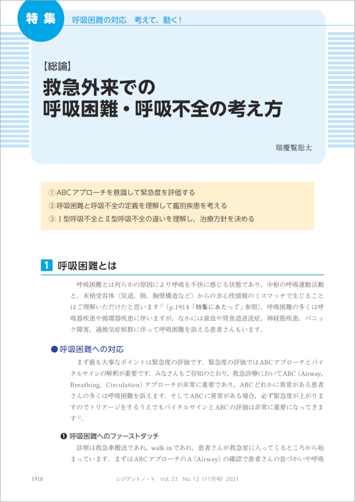 「鼻が詰まったりすると 解るんだ 今まで呼吸をしていた事」 これは,私が好きなロックバンドBUMP OF CHICKENの『supernova』という曲に出てくる歌詞です.普段私たちが無意識に行っている呼吸.それは当たり前すぎる存在でありながら,生命維持にとって必要不可欠な存在でもあります.そんな呼吸も,鼻が詰まることでヒトは不快感を感じ,改めてその大切な存在に気づくのです.…と勝手に歌詞を解釈してみましたが,ここで登場した鼻が詰まることで感じる「不快感」,これこそが今回のテーマである「呼吸困難」です.… 武部弘太郎(京都府立医科大学 救急医療学教室/京都府立医科大学附属北部医療センター 救急科) 続きを読む