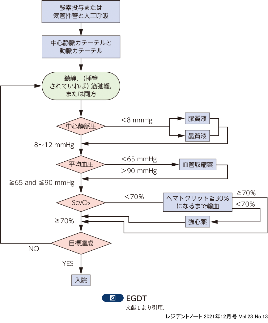 特集にあたって 特集にあたって 髙場章宏(JA広島総合病院 救急・集中治療科) 1敗血症パンデミックに備えよ! すべての診療科で遭遇する致死的な疾患といえば,敗血症.日本では高齢化に伴い,敗血症患者がさらに増加すると予想されています.その予後を左右するのは,早期診断・早期治療.一晩の遅れは,まさに命取りとなります.あなたは自信をもって対応できますか? 2複雑化した敗血症診療 私が初期研修医だった10年前,敗血症性ショックの治療といえば,EGDT(early goal-directed therapy,早期目標指向形治療)が主流でした.中心静脈圧を指標として十分な輸液を行い,それでも平均血圧が低ければ血管収縮薬を使用,ショック(=酸素需給バランスの異常)が改善しているかどうかをScvO2で判断し,目標に到達していなければ動脈血酸素含有量を増やすために輸血するか,心拍出量を上げるために強心薬を使用する,というものです(図)1).プロトコルの指標と目標値がはっきりしており,研修医でもこの通りに行えば対応できたので,私は敗血症診療が好きになりました. しかし,その後行われた検証で,EGDTは通常治療と比較して,予後を改善しないことが示されたのです2〜4).この10年ではっきりしたこと,それは,① ショックの臨床症状は複雑・曖昧であり,単一の指標を用いて治療介入を決定するのは困難である,② 敗血症は異質性の高い症候群であり,EGDTのような画一的な治療ではうまくいかないこともある,ということだと思います. 敗血症のガイドラインを読んで,イマイチどうすればいいかわからないと思った読者の方もいるのではないでしょうか.それは,「こういうときは,こうしておけばOK!」という,誰にでも使える万能な診療方法がないからです.敗血症診療は,複雑なんです. 3敗血症患者を“一晩診る”ために必要な意思決定 とはいえ,緊急性の高い敗血症診療では,検査する/しない,治療する/しない,専門医を呼ぶ/呼ばない…といったことを,迅速に決めなければなりません.医師の主な仕事は,意思決定なのです. 敗血症患者を一晩診るうえで,予後を左右する意思決定のポイントがいくつか存在します.本特集では,そのポイントをひとつの症例の時系列に沿って,考え方はシンプルに,アクションは具体的になるよう解説していきます. 1)敗血症とショックに気づく(pp.2076〜2084) “敗血症に気づく”というスタート地点に立てなければ,早期介入は不可能です. 発熱がなくても感染症を疑えますか? 血圧が保たれていてもショックを認識できますか? ここが最も難しく,最も重要なポイントです. 2)救急外来での循環管理(pp.2085〜2094) 敗血症は循環を不安定にし,あっというまに患者さんをショックに陥れます.輸液の指示や,血管収縮薬の指示は出せますか? 崩れた循環を立て直すための,初期蘇生の戦略を解説します. 3)感染源の検索(pp.2095〜2102) 全身管理だけ頑張っても患者さんは救えません.感染症に対する治療こそ根本治療であり,そのためには敵が何者なのかを特定する必要があります.感染源検索の「型」を身につけましょう. 4)抗菌薬の投与 その① 原因微生物の推定(pp.2103〜2112) 5)抗菌薬の投与 その② 抗菌薬の選び方(pp.2113〜2124) 患者背景,感染臓器から原因微生物を推測し,なるべく早く,適切な抗菌薬を投与しなければなりません.そのためには,微生物・抗菌薬双方の知識が必要です.グラム染色をベースにした抗菌薬の選び方を解説します. 6)感染源のコントロール(pp.2125〜2131) 状態が悪いときこそ,ドレナージやデブリードマンを行って感染の元を断つ必要があります.とはいえ,専門医を呼ぶのはハードルが高いですよね.そのコツと心得も伝えます. 7)ICUでの循環管理(pp.2132〜2140) ショックを離脱できないとき,どうすればよいのでしょうか? 重症患者における全身管理の最重要点は,酸素需給バランスを整えることです.この目的を常に意識することで,ショック治療の三本柱を理解できるはずです. 8)病状説明における意思決定(pp.2141〜2148) 敗血症に限らず,重症患者を診るとき,避けて通れないのが患者さん・家族に「重い話」をして,治療方針を決めること.初期研修医には荷が重いかもしれませんが,主治医の責務です.なぜ難しいのか? その理由から,コツを解説していきます. 当直で敗血症に出会っても自信をもって対応できるよう,最も大事な“一晩”の初期対応スキルを身につけていきましょう! ※2021年10月6日追記:この特集を書き終えようとしていた10月2日に,敗血症の国際的ガイドラインであるSSCG 2021(surviving sepsis campaign guidelines 2021)5)が公表されました! 非常に実践的なガイドラインとなっており,一読されることをお勧めします.本特集の内容も,このガイドラインの推奨とおおむね相違ないと思います(ガイドラインにあわせて急遽修正する必要がほとんどなかったので,助かりました). 引用文献 Rivers E, et al:Early goal-directed therapy in the treatment of severe sepsis and septic shock. N Engl J Med, 345:1368-1377, 2001(PMID:11794169) Yealy DM, et al:A randomized trial of protocol-based care for early septic shock. N Engl J Med, 370:1683-1693, 2014(PMID: