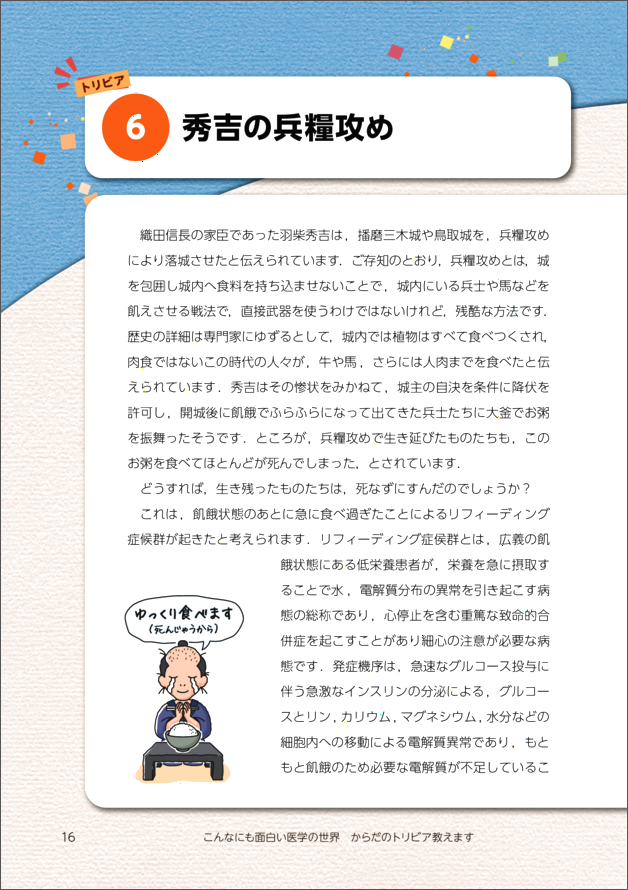 マリンスポーツと納豆アレルギーの意外な関係性とは?秀吉の兵糧攻めにはある疾患が隠されていた!?など,身近に潜む医学の雑学「トリビア」満載の1冊.へぇーそうだったんだ!と思わず誰かに教えたくなること必至!