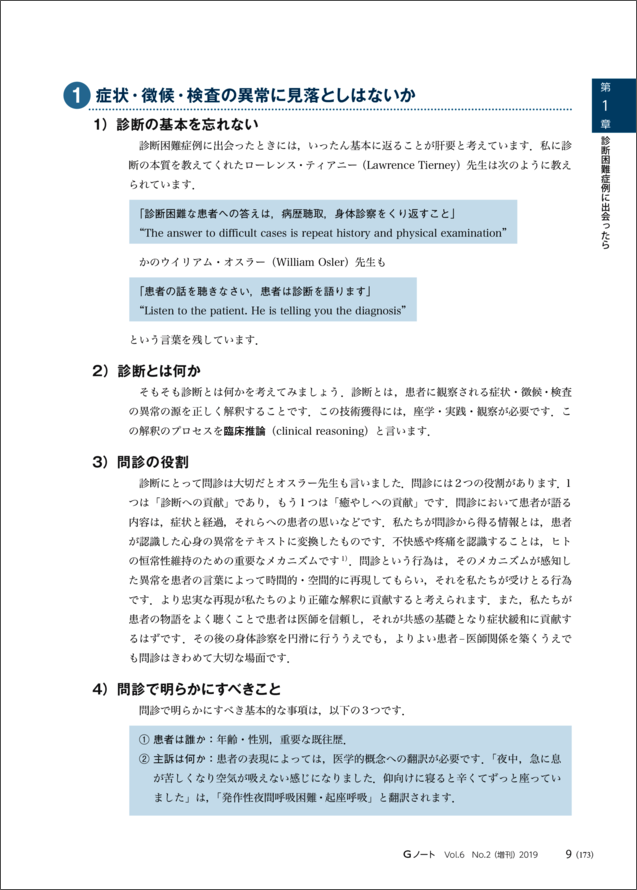 総合診療医を総合診療医たらしめるコンピテンシーはいくつもありますが,そのなかでも特に重要な部分を担っているのが,診断能力の幅広さ,すなわち臨床推論の多能性ではないでしょうか.プライマリ・ケアの5つの理念であるACCCAの中の1つのComprehensiveness(包括性)の評価指標の1つに,診断病名の多様さがあげられていることにも,それは如実に表れています.近年,診断学の良書が多く出版され,文献へのアクセスも整備され,われわれはその恩恵にあずかって日々診断しています.しかし,それでも診断に苦慮することは少なくありません.私は無床診療所と小病院で臨床業務を行っており,かつては大学病院で勤務した経験もありますが,検査機器の有無や患者の種類だけでは説明しきれない,おのおのの現場における診断の難しさがあり,最終的に診断が確定できなかった事例も複数経験しています.皆さんもきっとそんな経験があるのではないでしょうか.そんなとき,われわれはしばしば診断を「あきらめ」たり,臨床推論を「中止し」たりしていないでしょうか.