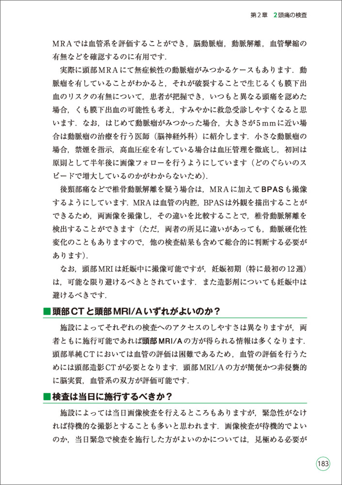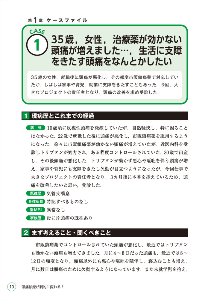 34歳の女性.高校生頃よりくり返す頭痛あり,市販薬で対応していた.今回,嘔吐を伴う頭痛あり,近医では頭部CTで異常を認めず,トリプタンとNSAIDsが処方されたものの効果なし.いつもの頭痛より長く続くため歩いて受診した.…