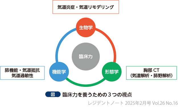 特集にあたって 特集にあたって 丸毛 聡(医学研究所北野病院) 研修医1年目の皆様,まもなく研修生活も1年が経とうとしています.この1年間で少しずつ仕事のペースをつかみ,自信もつきはじめたことと思います.これからは新しい知識をどんどん吸収し,医師としての基盤をさらに固めていく時期です.また,研修医2年目の皆様にとっては,いよいよ研修生活の仕上げに差し掛かる頃です.最後の数カ月で得られる経験や学びが,今後の医師人生に大きく影響を与えることは間違いありません. 本特集では,「慢性閉塞性肺疾患(COPD)」と「気管支喘息」という,呼吸器疾患のなかでも特に重要かつ学びがいのあるテーマをとり上げます.この2つの疾患は,若手医師にとって臨床現場での接触機会が以前と比べて減少している現状があります.かつては増悪による救急受診や入院が頻繁にみられる疾患でしたが,近年では増悪を予防する治療法の進歩により,入院に至らないケースも増えています.しかし,これにより実際に増悪病態の経験が減少し,診療の勘所を身につける機会が少なくなっているという課題も浮かび上がっています.そこで本特集では,COPDや喘息の増悪管理について再確認し,若手医師の皆様に実践的な知識を提供することをめざしました. 1COPD・喘息は他疾患の予後にも影響を与える COPDや喘息は単なる呼吸器疾患として捉えられることが多いですが,実は心血管疾患や肺がんなど,ほかの疾患の予後に密接に関与する重要な因子でもあります.例えば,COPDは心血管疾患のリスクファクターであり,肺がん患者においても予後不良因子として知られています.また喘息も他疾患のコントロールに影響を与えることが知られています.そのため,これらの疾患の長期管理は,増悪を抑制するだけでなく,他疾患への影響という観点でも非常に重要です.そこで本特集では,この長期管理について推奨されるワクチンを含めて詳細に解説し,呼吸器疾患の枠を超えた視点を提供いたします. 2生物学・機能学・形態学の視点から疾患を理解する さらに本特集では,3つの視点(生物学・機能学・形態学)に即して疾患を理解するために,病態生理学や機能学,形態学の最新情報をとり上げました.この3つの視点は,すべての医学領域において臨床を深く理解するために必要であり,COPD・喘息は,まさにこれら3つの視点が臨床に直結する代表的な疾患であります(図).例えば,生物学的にはいわゆる2型の炎症反応や免疫応答の理解が求められ,機能学的には肺機能検査の結果の解釈が不可欠です.形態学的には胸部CTなどの画像解析を通じた病態の把握が疾患理解を深めることとなります.これらの視点をバランスよく学ぶことで,呼吸器志望であるかどうかを問わず,医師としての疾患の適切な評価方法を身につけることができるでしょう. 以上のような背景から,本特集では「1章:COPD・気管支喘息の診療がもっとできる!」でCOPD・喘息の診断から治療に至るまで(具体的には診断評価,長期管理,増悪管理と予防医学まで),解説しました.そして「2章:COPD・気管支喘息の診療がもっとわかる! 面白くなる!」では一歩進んで,生物学的・機能学的・形態学的な理解を深めることをめざし,病態生理や臨床研究について解説しました.本特集が,読者の皆様のCOPD・喘息診療レベルアップに寄与するだけでなく,医学を深く学ぶ姿勢の確立にもつながることを心より願っております. 研修医の皆様のご活躍をお祈り申し上げ,本特集の巻頭言といたします. 著者プロフィール 丸毛 聡(Satoshi Marumo) 医学研究所北野病院 病院長補佐/呼吸器内科部長/感染症科部長/感染制御室室長 重症喘息における本邦最大規模のコホートJ-CIRCLE代表も務める.モットーは,どんなことも楽しむこと.北野病院で楽しく一緒に臨床・研究できる仲間を待っています.