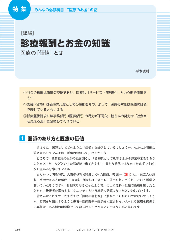 今回の特集は,『医療に関するお金のお話』です.読者の皆さんは大半が研修医を中心とした若手の先生だと思いますが,皆さんはご自身のお仕事が生み出す「お金」について考えたことがあるでしょうか.最近は少し風向きが変わりつつあるものの,少なくとも一昔前までは臨床現場において「医は仁術」「医療者がお金にこだわるなんてとんでもない」という共通認識がありました.…