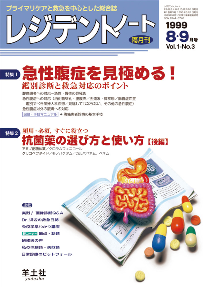 特集1 急性腹症を見極める! 鑑別診断と救急対応のポイント.特集2 頻用・必須,すぐに役立つ抗菌薬の選び方と使い方[後編].「急性腹症の診断・対応」と,「抗菌薬の選び方と使い方(後編)」を特集します.連載は「画像診断Q&A」「Dr. 浜辺の救急日誌」などに加え,最近話題にのぼる様々な医療の問題を採り上げる新コーナー「論点・話題」も始まります.