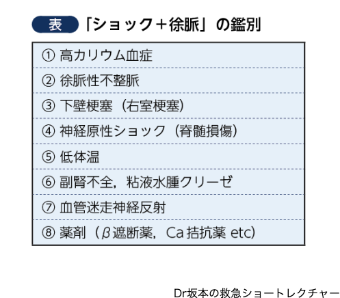 「ショック+徐脈」を引き起こす病態は表の通りです.このうち院内で起こりえるものは,① 高カリウム血症,② 徐脈性不整脈,③ 心筋梗塞,⑦ 血管迷走神経反射,⑧ 薬剤性などでしょう.このなかで緊急性の高い①〜③は検査の三種の神器を使えば判断可能です.研修医のうちにこれら3つの検査は自信をもって行えるようにトレーニングしましょう.