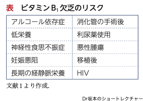 Wernicke脳症はビタミンB1欠乏が主たる原因ですが,ビタミンB1が欠乏してしまうアルコール多飲以外の原因をご存じでしょうか? 表にあるように原因はさまざまで,明らかな栄養不足が示唆される場合には忘れず対応できても,長らくブドウ糖の点滴のみで管理されていた症例や,徐々に食事摂取量が低下している高齢者が利尿薬内服している場合などは,意外と見逃されているのではないでしょうか.