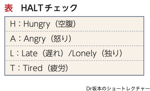 ER診療をはじめる際,怒りが生まれそうな第一次感情(不安,不満,疲労など)を自身がもっている場合には,まずそれを認識し,なるべく解消してから臨むことが大切です.HALTチェック(表)などを利用し,診療前にコンディションを整えることを心掛けましょう.無論,当直の前日は夜更かししない,飲み過ぎないなどの体調管理は必須です.私は,ER診療前や診療中に疲れが溜まった際や苛立ちを自覚した場合には,一呼吸置き,気持ちを切り替えてから臨むようにしています1).