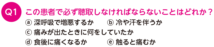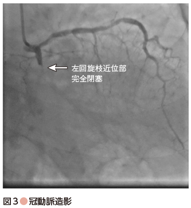 循環器の検査に関する問題 問題53,問題54の続き2日前から持続する胸痛を主訴に救急搬送された82歳女性 症例の続き 心臓カテーテル検査後 心臓カテーテル検査を施行したところ,左回旋枝領域が近位部で完全閉塞の所見を認めた(図3).よって,今回の胸痛の原因,また心原性ショックの原因は左回旋枝領域の急性心筋梗塞と診断.血圧低下も遷延していたため,昇圧薬サポートを行い,同部位に対してPCIを行った.最終的に完全閉塞部位に対して薬剤溶出性ステントを1本留置し,手技終了.その後,胸痛症状も改善,バイタルサインも改善.血圧は180 mmHg程度まで上昇したため,昇圧薬使用も中止とした. カテーテル治療終了後,集中治療室に入室準備をしていたところ,突然PEA(無脈性電気活動)となり,心肺蘇生を行ったところ,いったん,ROSC(return of spontaneous circulation)した. PEA の原因精査として,すぐに行うべき検査項目はどれか? ⓐ再度心臓カテーテルを行う ⓑ胸部X線 ⓒ心エコー図 ⓓ造影CT 解答を見る