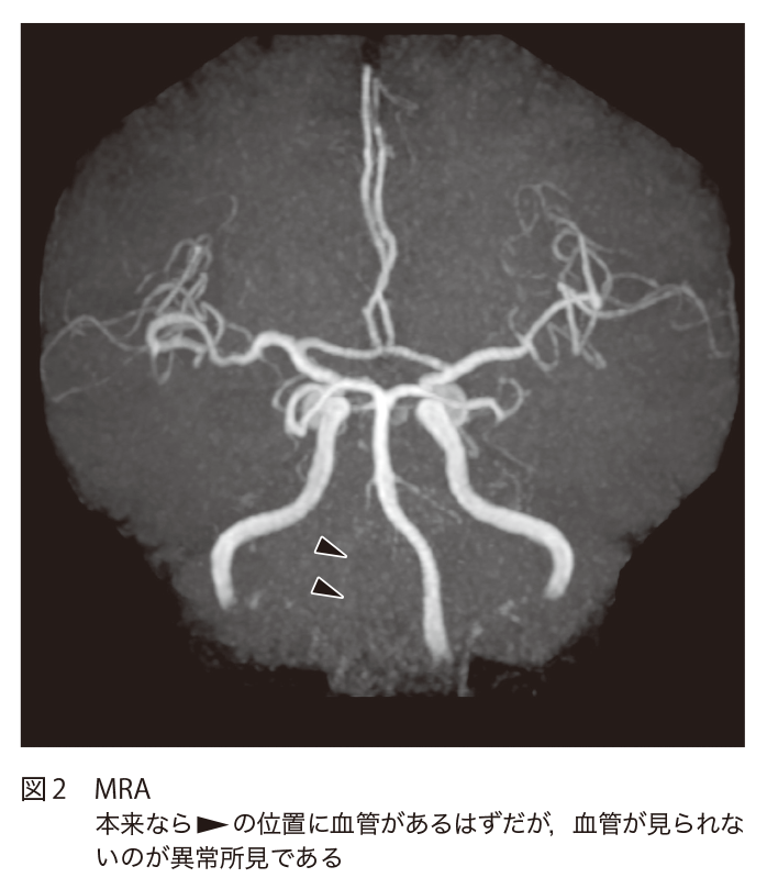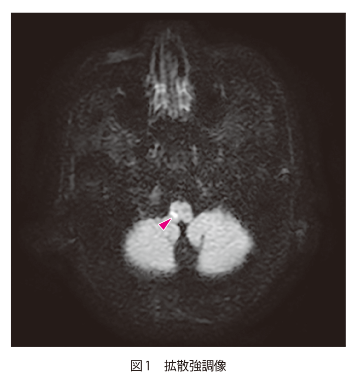 頭痛と歩行障害で救急受診した70歳代男性 70歳代男性,頭痛で近医受診.頭部CTでは異常なしと診断された.翌日より歩行困難と嘔吐が生じたため救急受診し,頭部CTが施行された. A1.椎骨動脈解離による延髄外側梗塞A2.脳外科へのコンサルト 1.診断のポイント 延髄右側に拡散強調像高信号がみられ(図1▶︎)ADC値も低下している(非呈示).急性期梗塞の所見である.MRAでは右の椎骨動脈が全く描出されていないが(図2▶︎),FLAIRでは淡い高信号として描出されており,内部に低信号域がみられる(図3▶︎).同日のCT血管造影では右椎骨動脈は動脈相で淡い造影効果を呈し,内部にflap状の構造がみられる(図4▷).右椎骨動脈解離による延髄梗塞である. 2.鑑別診断1) 延髄に病変をきたすものが鑑別となりうる. 1 梗塞 椎骨動脈解離によらないラクナ梗塞,アテローム血栓性梗塞で延髄梗塞をきたす.アテローム血栓性梗塞は延髄外側よりも内側に起こりやすい. 2 腫瘍 毛様細胞性星細胞腫,血管芽腫や,低悪性度の神経膠腫,神経膠芽腫などが鑑別にあがるが,低悪性度の神経膠腫以外は頻度も少なく,経過も異なる. 3 感染・炎症性疾患 小さな膿瘍が梗塞と紛らわしい場合があるが,稀である.感染性脳炎としてHIV患者におけるサイトメガロウイルス感染,単純ヘルペスウイルス感染で延髄単独病変の報告がある.またADEM(acute disseminated encephalomyelitis:急性散在性脳脊髄炎)が片側性に延髄病変をきたす場合がある.しかし,これらの経過や症状は延髄梗塞とは異なる. 4 脱髄疾患・代謝性疾患など 視神経脊髄炎関連疾患,多発性硬化症の延髄病変が片側性に出現する場合がある.Sjögren症候群,Behçet病,サルコイドーシスも片側に出現する場合がある.ただしこれらも経過や症状は延髄梗塞とは異なると思われる. 5 その他 PRES(posterior reversible encephalopathy syndrome:可逆性後頭葉白質脳症)やAVF(arteriovenous fistula:動静脈瘻)で延髄に病変をきたす場合がある.また,肥大性オリーブ核変性症など類似の画像を呈する. 3.次の一手 脳外科にコンサルトを行う.画像的にはMRI撮像時に3Dグラディエント造影T1強調像が撮像できれば血管内膜のflapや解離腔自体の描出が可能であるが,病歴などから解離や梗塞を疑わなければ咄嗟に判断して造影するのは難しいかもしれない.延髄を含む後方循環系の梗塞は内頸動脈領域の梗塞と比較して発症早期での拡散強調像での偽陰性率が高く2),延髄では24時間以内での偽陰性率が高いとの報告があるため、発症早期に拡散強調像高信号が見られなくても超急性期の延髄梗塞を除外できないので注意しなければならない3,4). 救急医Check Point 脳動脈解離は,欧米では頭蓋外内頸動脈に多く,本邦では頭蓋内椎骨動脈に多い.40〜50歳代の比較的若年者に発生する.最も頻度の高い症状は頭痛,頸部痛で70〜80 %に認められ,椎骨動脈解離では後頭部や項部に限局した痛みがみられる.頭痛の特徴としては,はじめての痛み,顔面痛あるいは頸部痛,片側性,持続性(1カ月以内に寛解)などで,解離に伴う痛みであるにもかかわらず必ずしも突然ではなく緩徐に発症することも多い.頭痛の性状は多岐にわたり日常生活に支障がない程度の場合もあるため,性状のみで一般的な頭痛と区別することは困難である.首を鳴らす,急激に振り向くなどの頸部の回転動作の後に頭痛,頸部痛が発生した場合は椎骨動脈解離を疑うきっかけとなる. 発症様式は「虚血(脳梗塞,TIA)」「出血(くも膜下出血)」「無症状もしくは頭痛のみ」の3型となり,出血の有無が患者の予後を最も左右する.本症例を疑った場合は脳神経外科医への紹介が必須だが,「虚血」「出血」発症を疑った場合は可及的すみやかに外科的治療(血管内治療含め)を検討する必要がある.病理所見により確定診断となるが,実臨床においては画像検査(脳血管造影,CT,MRI)にて診断される.まずCTにて「虚血」「出血」の有無を評価し,その後はCTA,血管造影,MRI(MRA,BPAS)で詳細な評価をしていく.遠位の虚血のほとんどは,解離部位の部分的な狭窄や閉塞による低灌流によってではなく,解離部位から放出された塞栓によって起こる.「虚血」「無症状もしくは頭痛のみ」発症の場合は初回の画像検査での診断が困難なことが多いが,発症から3週間程度の間に患部に形態変化を生じることがよくあるため,発症時の症状(頭痛)で疑い,臨床経過,画像経過をフォローすることが重要である. 引用文献 Prakkamakul S, et al:MRI Patterns of Isolated Lesions in the Medulla Oblongata. J Neuroimaging, 27:135-143, 2017 Oppenheim C, et al:False-negative Diffusion-Weighted MR Findings in Acute Ischemic Stroke. AJNR Am J Neuroradiol, 21:1434-1440, 2000 Seo MJ, et al:Diffusion Weighted Imaging Findings in the Acute Lateral Medullary Infarction. J Clin Neurol, 2:107-112, 2006 Kitis O, et al:Wallenberg’s Lateral Medullary Syndrome:Diffusion-Weighted Imaging Findings. Acta Radiol, 45:78-84, 2004 参考文献 「ここまでわかる頭部救急のCT・MRI」(井田正博/著),メディカル・サイエンス・インターナショナル,2013 (2020/5/1公開) 戻る この"ドリル"の掲載書をご紹介します レジデントノート増刊 Vol.22 No.2画像診断ドリル救急医と放射線科
