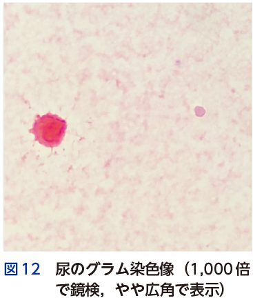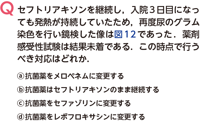頻尿を自覚し,排尿時痛を生じていた10歳代女性2 症例 10歳代後半の女性.2日前に頻尿を自覚し,昨日から排尿時痛を生じていたが,我慢していた.今朝になって急な悪寒戦慄があり,38.5℃に発熱していたため両親に連れられ救急外来を受診した.これまで既往歴はなく,アレルギー歴もない. 来院時の自覚症状は寒気のみであった.血圧128/72 mmHg,脈拍90回/分,呼吸数は20回/分,酸素投与なしでSpO2 97%であった.身体診察では左背部に叩打痛があるが,その他に異常所見はない.腎盂腎炎を疑い,尿培養および血液培養2セットを採取のうえ入院加療を行うことにした.あなたが入院担当となり救急外来に到着すると,すでに救急医がセフトリアキソンの点滴静注を開始していた. ※クリック/タップで拡大します ⓑ 抗菌薬はセフトリアキソンのまま継続する 「すぐ抗菌薬変更」より「まずグラム染色」 治療開始後も発熱が持続している場合,「抗菌薬は有効だけれども炎症がまだ改善してきていない」のか,「抗菌薬が効いていないために炎症が続いている」のかを慎重に見極める必要があります.発熱の持続に焦ってしまい,無分別に抗菌薬を変更すると,かえって効果の乏しい抗菌薬を選んでしまいかねません.一方,実際に抗菌薬が効いていないのならば,効果が期待できる抗菌薬にすぐ変更しなければなりません.私たちは,どうすればこの2つの可能性を見分けられるのでしょうか. 答えは「もともと見ていた起因菌が消失しているかどうかをグラム染色検査で確かめること」です.治療前は,Escherichia coliと推定できるグラム陰性桿菌が視野一面に見えていました(図11).しかし,入院3日目の尿グラム染色像では菌体が完全に消失しています(図12).つまり抗菌薬が奏効していることが確認でき,この時点では抗菌薬を焦って変える必要がないことが確かめられたのです.急性単純性腎盂腎炎の症例のうち,26%が48時間以上発熱していたという報告1)があるように,入院3日目に熱が続いていても「抗菌薬が効いてない」とは言い切れません.発熱や炎症反応だけで抗菌薬の効果を判定するのではなく「起因菌が残っているのか,いないのか」をグラム染色検査で迅速に確かめることが大切です. 引用文献 Behr MA, et al:Fever duration in hospitalized acute pyelonephritis patients. Am J Med, 101:277-280, 1996 (2021/09/24公開) 戻る この"ドリル"の掲載書をご紹介します グラム染色診療ドリル 解いてわかる!菌推定のためのポイントと抗菌薬選択の根拠 林 俊誠/編 定価:3,960円(本体3,600円+税) 在庫:あり 月刊レジデントノート 最新号 次号案内 バックナンバー 連載一覧 定期購読案内 定期購読WEB版サービス 定期購読申込状況 レジデントノート増刊 最新号 次号案内 バックナンバー 定期購読案内 residentnote @Yodosha_RN その他の羊土社のページ ウェブGノート 実験医学online 教科書・サブテキスト 広告出稿をお考えの方へ 広告出稿の案内