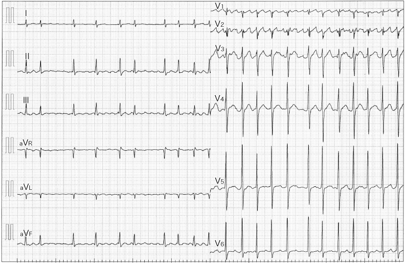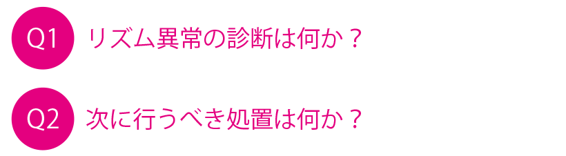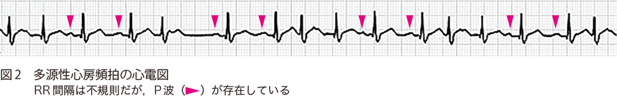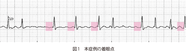 69歳男性,動悸と易疲労感を常に認めていた 69歳男性,高血圧で内服加療中.3年前から動悸発作をときどき自覚していたが,最近は動悸と易疲労感を常に認めていた.肩関節を脱臼し,整形外科病院に入院したが,入院中の心拍数が持続的に高値のため,手術延期となり紹介受診した. 来院時,意識清明,身長169 cm,体重 60 kg,血圧116/87 mmHg,脈拍124回/分 不整 胸部:心雑音なし,Ⅲ音(+),肺野ラ音なし,下腿浮腫なし 胸部X線:心胸郭比 52.4%,左少量胸水(+),肺うっ血(±) 経胸壁心エコー検査:AoD 35 mm,LAD 49 mm,IVS 6 mm,PWT 7 mm,LVDd 48 mm,LVDs 36 mm,EF 48%,軽度のびまん性左室壁運動低下あり,有意な弁膜症なし 来院時の12誘導心電図を示す. A1.頻脈性心房細動A2.レートコントロール治療,抗凝固療法 1.診断のポイント ①RR間隔の絶対的不整 ②P波がない.心房細動波の存在 2.心電図波形の所見 RR間隔の不整には規則性がなく,絶対的不整を呈している(irregularly irregular).また1心拍のみに着目すると一見P波様の波形を呈しているものもあるが,ほかの部分を確認すると再現性をもって同じ形を示すものはなく,これがP波ではなく細動波(f波)を表していることがわかる(図1).本例の心電図ではf波が明瞭だが(coarse AF),f波振幅が低い心房細動(fine AF)では,一見すると平坦な基線のように見えることがあり注意が必要である. 3.鑑別診断 1 頻発性心房期外収縮または多源性心房頻拍 心房期外収縮が多発しているとRR間隔が不整となり,心房細動に見えることがある.P波の形が3種類以上ある場合は多源性心房頻拍と呼ばれる.加えて心電図の記録状態が悪いと,基線のアーチファクトがf波様に見え,心房細動と誤認する原因になるので注意が必要である.可能ならば12誘導心電図を記録して,P波の有無(図2)を確認することが心房細動との鑑別に大切である. 2 心房粗動 心房粗動でも房室伝導比が不定だとRR間隔が不整となり,心房細動のように見える(図3).特に非通常型の心房粗動では,粗動波が鋸歯状にならないので見落としやすい.鑑別の基本は12誘導心電図を記録し,粗動波の有無を確認することである. 4.次にどうするか 本例は頻脈性心房細動にうっ血性心不全を伴っており,最初の治療は心房細動のレートコントロールである.以前はジゴキシンが第一選択だったが,労作時など交感神経緊張時のレートコントロール作用が弱く,現在はβ遮断薬が第一選択である. ●処方例 ビソプロロール(メインテート®)1.25〜5 mg 1日1回 朝 喘息などでβ遮断薬が使用できないときは,ベラパミルやジルチアゼムもレートコントロールに有効だが,心機能抑制作用が特に前者で強いので,心機能低下例では注意が必要である.レートコントロールが不十分なときは,上記薬剤の併用投与を行うが,難治例で特に重度心機能低下例ではレートコントロール目的でアミオダロン(アンカロン®錠)を使用する場合もある.また血栓塞栓症予防のための抗凝固療法も必須である.早急なコントロールが必要な場合は,経食道エコーで血栓有無を確認のうえ,電気的除細動も考慮される.本例でみられた左心機能障害はびまん性の壁運動低下で,虚血などほかに心機能低下をきたす原因がなく,頻脈持続に伴うものが疑われた(頻脈誘発性心筋症).本例はレートコントロールを行って心不全が改善した後に,カテーテルアブレーションを行い洞調律となった.術後,症状は消失し,左心機能も正常化した. 5.より深い話 心房細動のレートコントロールにおける心拍数の目標値はいくつだろうか? 以前は安静時80回/分未満など,より厳格なコントロールが求められていたが,RACE Ⅱ試験では安静時110回/分未満の緩徐なコントロール群の臨床転帰は厳格コントロール群と同程度だった1).しかしRACE Ⅱ試験では緩徐コントロール群も観察期間中は90回/分未満となっており,安静時心拍数の目標値としては,100回/分未満程度をめざすのが妥当と思われる.注意すべきこととして,心拍数は労作時と安静時では異なるため,患者の活動度が高いと安静時心拍数の評価のみでは不十分となるし,また基礎心疾患,高血圧などの併存疾患の有無で心機能悪化の閾値は異なってくる.そのため目標心拍数は患者ごとに設定すべきで,症状や心機能の経過次第で,緩徐なコントロールで留めるか,より厳格にコントロールするかを決定するのがよい.また心不全患者ではレートコントロールを行うよりも,アブレーションでリズムコントロールを行った方が心機能をより改善し,予後も良好であることがCASTLE-AF試験により示された2).したがってアブレーションにより洞調律維持が期待できる心不全患者では,本例のように積極的にアブレーションを検討すべきである. 文献・参考文献 Van Gelder IC, et al:Lenient versus strict rate control in patients with atrial fibrillation. N Engl J Med, 362:1363-1373, 2010 Marrouche NF, et al:Catheter Ablation for Atrial Fibrillation with Heart Failure. N Engl J Med, 378:417-427, 2018 (2020/3/23公開) 戻る この"ドリル"の掲載書をご紹介します レジデントノート増刊 Vol.21 No.2心電図診断ドリル波形のここに注目! 森田 宏/編 定価:4,700円+税 在庫:あり 月刊レジ