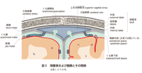 若手放射線科医:髄膜(meninges)というのは硬膜(dura mater),くも膜(arachnoid mater),軟膜(pia mater)を総称した名称ですね.最外側に硬膜があり,その直下にくも膜,その下には脳脊髄液が入っているくも膜下腔があり,最内側には脳に密着した軟膜があります(図3を参照).