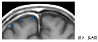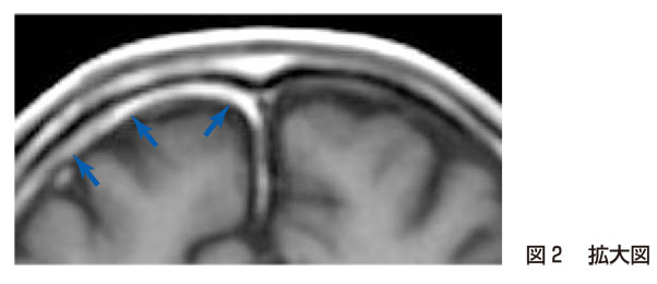 研修医:はい.(造影T1強調画像である)図2を外側から順にみると,皮下組織(高信号)→外板(無信号)→板間層(高信号)→内板(無信号)→硬膜(一般には中等度の信号,本例では右側が肥厚し高信号:→)→くも膜下腔(著明な低信号)→灰白質となっているわけですね! つまり,この症例では右前頭部で硬膜の肥厚と造影効果が目立っているのですね(図2拡大図を参照).
