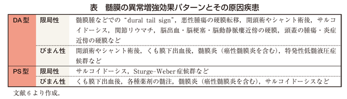 若手放射線科医:もちろんありますよ.MRIでの髄膜の異常増強効果は,硬膜,硬膜下腔,くも膜が主体の“dura-arachnoid pattern”(DA型)と,もう1つはくも膜下腔,軟膜が主体の“pia-subarachnoid pattern”(PS型)に分けられます(図5).また,両者が混在することもあり,これらは疾患の鑑別上も非常に重要です.