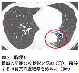 放線菌は口腔内常在菌であり肺放線菌症のリスク因子としてはアルコール多飲,口腔内不衛生,肺気腫や気管支拡張症などの呼吸器疾患の合併があげられる.本症例では,アルコール多飲がリスク因子と考えられる.胸部CTでは結節や腫瘤,コンソリデーションを形成することが多く,陰影の周囲にはすりガラス影を伴うことがある1).特に肺がんとの鑑別が臨床的に重要であり,外科的切除が行われてはじめて本症の診断に至った症例も多く報告されている2).治療としてはペニシリン系抗菌薬が第一選択薬であり,6~12カ月と長期間の投与を必要とする.