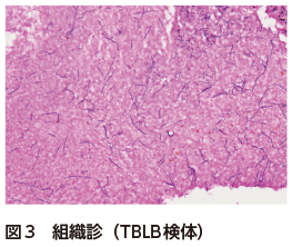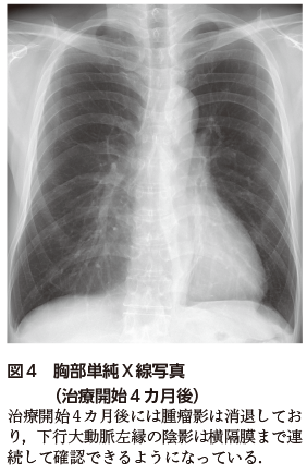 胸部単純X線写真では一見すると両肺野に明らかな異常陰影を指摘できないが,注意深く観察すると下行大動脈左縁の陰影が途切れていることがわかる(図1→).このような所見をシルエットサインが陽性であると表現し,病変が下行大動脈と接していることを示している.このような心陰影と重なった結節影や腫瘤影を見つける際に,下行大動脈とのシルエットサインの有無はきわめて有用な所見である.胸部CTではS6からS10にかけて腫瘤を認め周囲に粒状影を伴っており(図2◯),また腫瘤に隣接する気管支の壁肥厚もみられる(図2▶).これらの画像所見から肺化膿症を含めた感染症が第一に疑われたものの,原発性肺がんを含めた他疾患との鑑別目的に気管支鏡検査を施行した.経気管支肺生検(transbronchial lung biopsy:TBLB)を行い,一般細菌および抗酸菌培養検査は陰性であったものの,組織診では膿瘍や炎症細胞浸潤のほかにグラム染色およびグロコット染色陽性となる桿菌を多数認め,肺放線菌症が疑われた(図3).本症例では経口ペニシリン系抗菌薬による内服治療を開始し,治療開始後約4カ月時点で胸部単純X線写真上の腫瘤影はほぼ消退した(図4).今後は計6~12カ月を目安に抗菌薬加療を継続する方針としている.