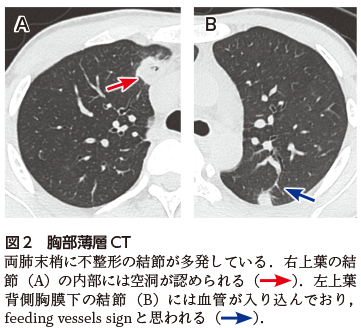 敗血症性肺塞栓症は,細菌などの病原体が血行性に散布され,肺に塞栓をきたした状態で局所に膿瘍を形成する.原因となる塞栓子は,菌塊や感染性の静脈血栓が大部分である.感染源としては右心系感染性心内膜炎が多く,敗血症や血栓性静脈炎,カテーテル関連の感染,歯科や外科処置後などでもみられる.症状は発熱,呼吸不全,血痰,胸痛などであるが,自覚症状に乏しいこともある.敗血症性肺塞栓症の診断には画像診断が有用で,胸部単純X線写真では両側多発性に結節影や限局性浸潤影,CTでは末梢胸膜下に辺縁不整な結節を認め,さまざまな程度で空洞化する(図2A→).結節には血管が連続する所見がみられることもあり,feeding vessel signと呼ばれる(図2B→).胸水を伴うことが多い.