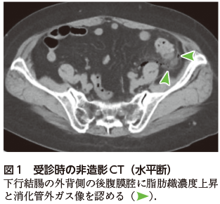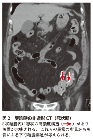 〈その後の経過〉詳細に問診をすると,2日前にカレイを摂取しており,カレイの骨による下行結腸穿通と考えられた.絶食,抗菌薬による保存的治療を開始,3日後のCTにて魚骨は消失しており,排泄後と考えられた.1週間後には症状改善,2週間後に退院となった.