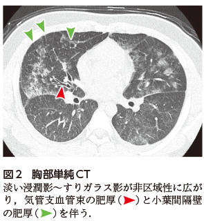 胸部単純X線写真(図1)では両側中下肺野優位にやや淡い浸潤影が広範囲にみられ,心陰影や横隔膜など既存の構造物のシルエットが不鮮明になっている.Hilar hazeを認める(図1→)ことから気管支血管束や小葉間隔壁といったいわゆる広義間質にも病変があることが示唆され,肺水腫や好酸球性肺炎が鑑別にあがる.右肋横隔膜角が不鮮明であり若干の胸水を伴う可能性がある.胸部CT画像(図2)でも非区域性の淡い浸潤影とともに気管支血管束や小葉間隔壁の肥厚が確認できた(図2▶▶).心拡大や身体所見で浮腫がないことから心不全は否定的であり,3週間前の喫煙開始エピソードと合わせて急性好酸球性肺炎(acute eosinophilic pneumonia:AEP)を第一に考えた.確定診断のために気管支鏡検査を施行し,右中葉で気管支肺胞洗浄(Bronchoalveolar lavage:BAL)を行った.気管支肺胞洗浄液(BALF)の有核細胞分画では好酸球が63%を占めていた.これらより喫煙開始に伴うAEPと診断し,プレドニゾロン0.75 mg/kg/日として60 mg/日で治療を開始した.6日後に撮像した胸部単純X線写真では多発浸潤影はほぼ消退していた(図3).プレドニゾロンを4週間程度かけて漸減終了した.