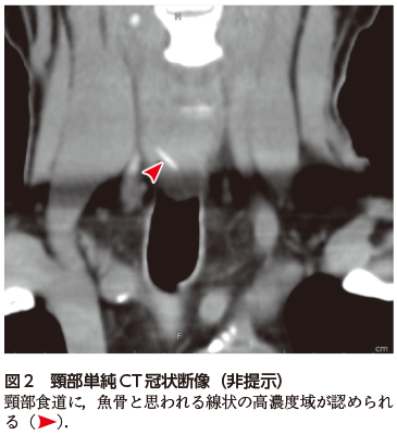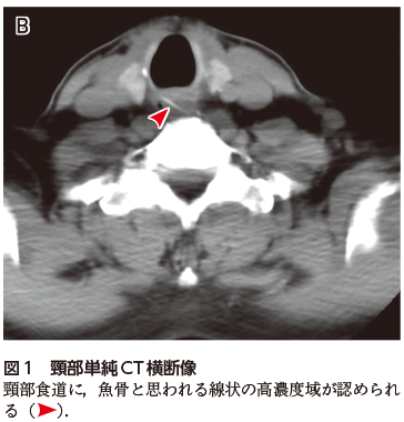 今回紹介するのは食用の魚の骨を誤飲し,食道壁に刺さった症例である.異物の誤飲は,国家試験ではそこまで多くとり上げられないものの,実臨床ではしばしば経験する.異物の誤飲は古くから小児に多いとされてきたが,近年は少子高齢化に伴い,むしろ高齢者での報告が増加している.なかでも魚骨による咽頭・食道損傷は決して稀ではない.「○○を誤って飲み込んだ」という訴えで来院されない場合もあるため,病歴よりも画像診断の重要性が高まることも留意しておく必要があるだろう.