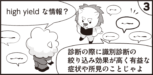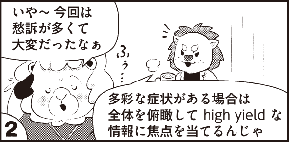 多彩な症状を訴える患者さんの場合,全体を俯瞰して診断に役立つ本質的な情報を抽出することが重要です.これを「病歴の抽象化」といいます.患者さんのすべての症状に均等に注目するのではなく,診断に直結しやすく,鑑別診断の絞り込み効果が高い「high yield」な情報,つまりキーポイントとなる症状や所見に着目します.
