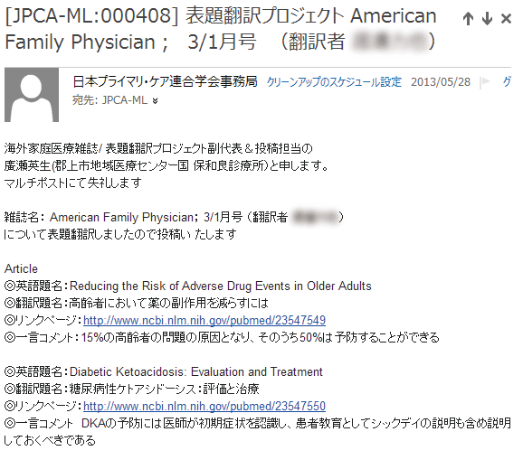 海外家庭医療雑誌 表題翻訳プロジェクト 佐々木隆史(京都家庭医療学センター 医療生協 こうせい駅前診療所) レジデントノート2014年2月号掲載 所属はレジデントノート掲載当時のものです [SHARE] ツイート すべてのプライマリケア医に最新の情報を! 突然ですが,皆様が上級医・指導医になったら知識のアップデートはどうされますか? レジデントノートや諸学会のガイドライン,MRさんの持ってくる情報でされるでしょうか? それともさらに上級医・指導医が教えてくれるでしょうか? 恐らく,独自の学習が必要となり,自分の専門とする分野の最新論文を定期的にチェックする必要が出てくることがあるかもしれません.最近はITが発達したためどこでも最新の情報が得られますが,「日常臨床で時間がない…」「海外の文献を定期的に読むのは…」という方もおられると思います. 配信メールの一例です.(クリックすると拡大されます.) そこで,“海外家庭医療雑誌 表題翻訳プロジェクト”が日本プライマリ・ケア連合学会の若手医師によって2009年から自主的にはじめられました.「すべてのプライマリケア医に最新の情報を!」をコンセプトに,American Family Physician,Annals of Family Medicine をはじめとする海外雑誌の文献表題翻訳を行っています.現在は16名のメンバーで定期的に文献を担当し,“文献表題翻訳”に加え,“文献へのリンク”“その文献に対する一言コメント”を記載して,日本プライマリ・ケア連合学会の公式メーリングリストなどに定期的に配信しています.また,2013年10月よりケアネットから配信されるコンテンツにも「1分でわかる家庭医療のパール」として連載を開始しています. 自己学習,社会貢献,英語の勉強が同時にできる! メンバーのメリットとして,文献を読みクリニカルパールをメール読者に伝える「自己学習」と,みんなに最新情報を発信するという「社会貢献」が同時にできます.監訳担当のメンバーが翻訳担当者の翻訳をやさしくフィードバックしていますので,安心して翻訳が可能です.また,シンプルに定期的な「英語の勉強」にもなります(笑).基本的にメール上のやり取りですので,全国どこでも,どなたでも参加可能です. 海外家庭医療雑誌 表題翻訳プロジェクトは,さまざまな人たちといろいろなものをつくり上げていくという,家庭医・総合診療医の得意とする領域だと考えています.このプロジェクトは初期研修医でも参加可能です.特に家庭医・総合診療医をめざされる皆様,ぜひ一緒に最新の情報を発信してみませんか? 代 表:佐々木隆史(京都家庭医療学センター 医療生協 こうせい駅前診療所) 副代表:廣瀬英生(郡上市地域医療センター 国保和良診療所) 副代表:今藤誠俊(医療福祉生協連 家庭医療学レジデンシー・東京 根津診療所)