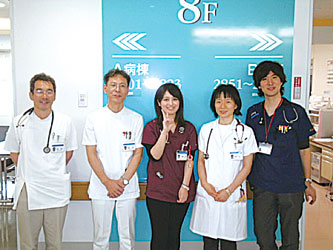 ↑部長の黒木先生(左から2番目),病棟医長の津本順史先生(左端),研修医の先生と筆者(右端).