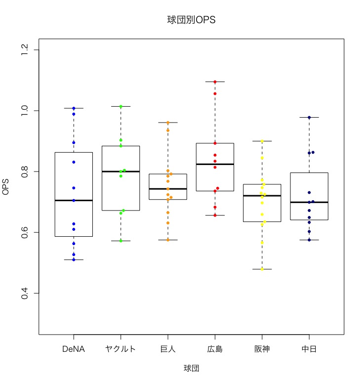 箱ひげ図をみると,優勝した広島打線の全体的な質の高さが,他の5チームと比べて違うというのがよくわかります.また,全体1位の選手も広島にいることがわかります.