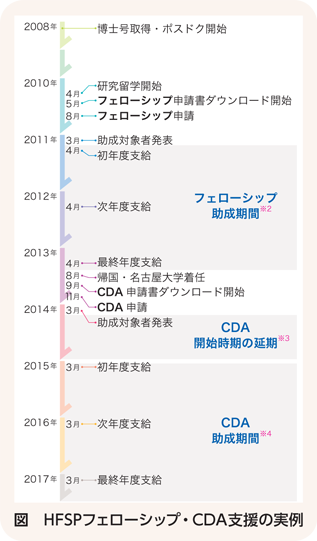 HFSPは数あるフェローシップのなかでも,3年間と期間が長く,また受給期間を柔軟に変更できたり,研究費がついたり,フェローシップ受給後に<CDA(キャリア・デペロップメント・アウォード,後述)>に申請できたりするため,将来のキャリアを考えるうえでもとても魅力的です.