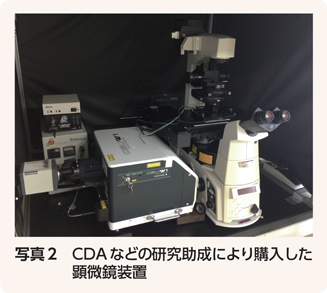また,帰国後,私の研究を進めるためには,どうしても光照射と高解像度の撮影を両立できる顕微鏡装置が必要だったのですが,CDAや他の研究費のおかげでなんとか購入することができました(写真2).最近になってようやく,ワクワクするよい結果が得られてきましたので,現在はこれらの研究成果を論文として早く公表できるよう頑張っています.