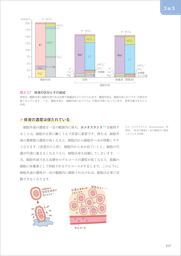 これまで,体液には血液,リンパ液,組織液(間質液)があることを勉強してきました ●.これら体液のうち,細胞内を満たすものを細胞内液 ●といいます.細胞内液では,細胞の機能を発揮するためのさまざまな化学反応が起こります.体液のうち,細胞外にある液体を細胞外液 ●といいます.細胞外液には,血液の液体成分である血漿 ●や細胞の周囲を満たす組織液(間質液),リンパ液などが含まれます.体液のうち,細胞内液が約65%,細胞外液が約35%を占めています ※1.…