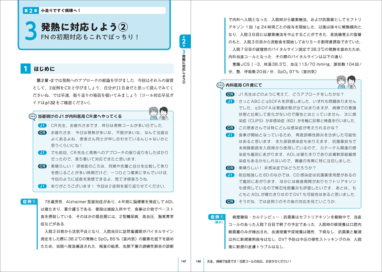 各病態の解説は、当直を振り返るチーフレジデントと研修医のリアルな会話を軸に進みます。実際に振り返りに同席している気持ちで、するすると読み進めることができるのが本書のポイントです。私も制作時、メリハリの効いた会話パートを読むのが、毎原稿とても楽しみでした。
