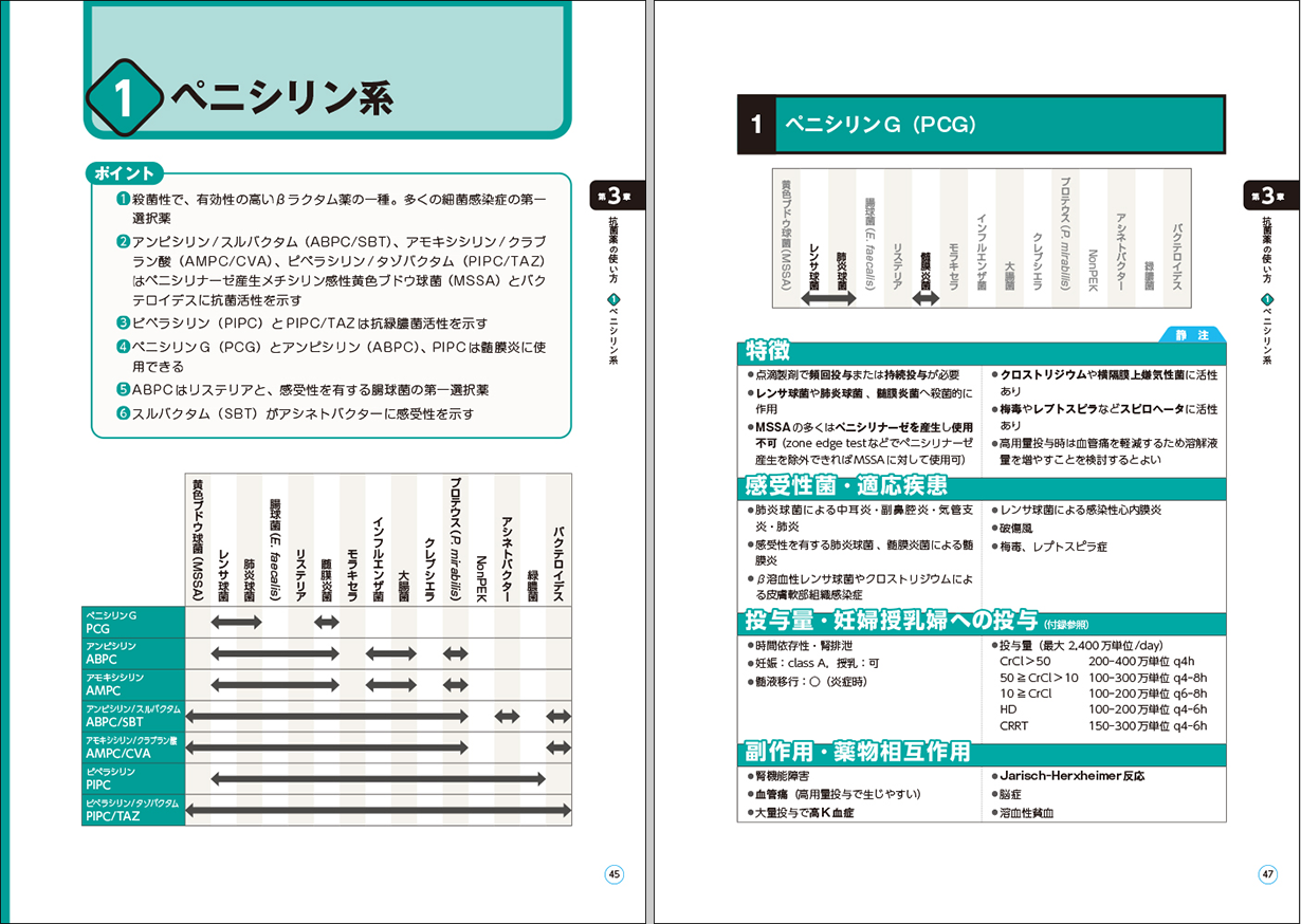本書では、原因菌–抗菌薬–感染症(感染源)の3つの観点から章立てが構成されており、表やリストによってこれら3つの観点の関連付けが効率よく整理できるようまとめられています。