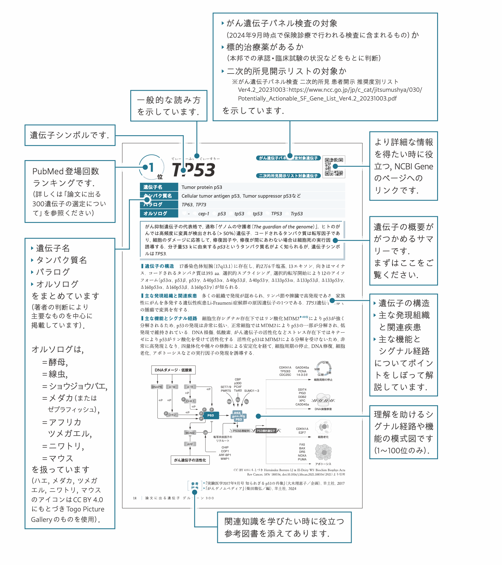 🧬 PubMed論文での登場回数が1〜300位の遺伝子を掲載。1〜100位は1ページに1遺伝子、101〜300位は1ページに2遺伝子のペースで、ヒトの主要な遺伝子を一気見できるようになっています。