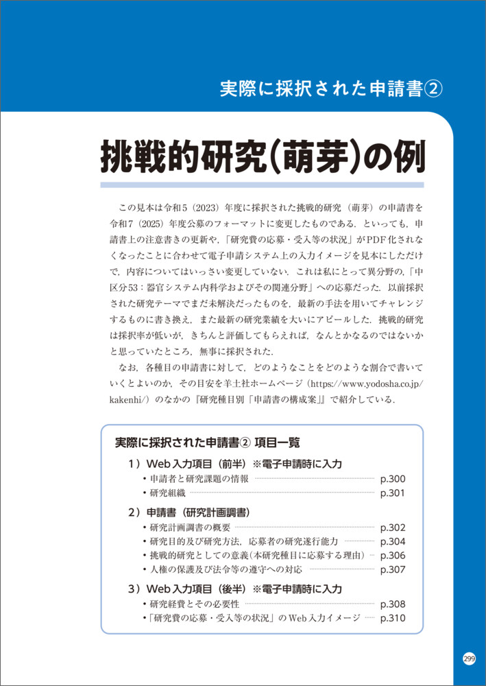 2023年に採択された「挑戦的研究(萌芽)」の申請書見本を掲載。実際の成功事例から、採択される申請書の「型」を学ぶことができます。
