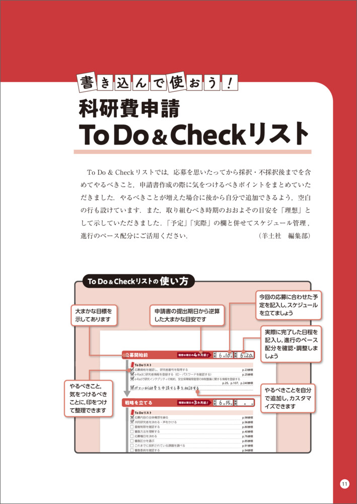 「To Do & Checkリスト」は、応募を思い立ってから採択・不採択後まで、やるべきことや気を付けるべきポイントがチェックリスト形式でまとめられています。科研費申請に不慣れな方でも、申請の全体像を把握し、抜け漏れなく準備を進めることができます。