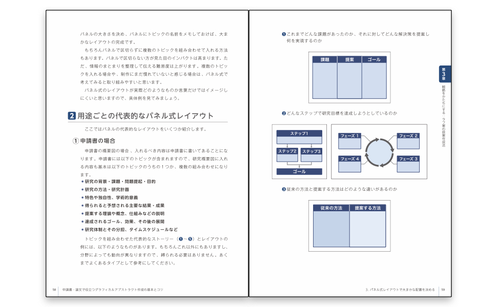 真っ白なキャンバスを前に手が止まってしまう方のために、レイアウトのパターンを具体的に提示。情報の詰め込みすぎを防ぎ、直感的な理解を促すための「情報の整理術」が学べます。